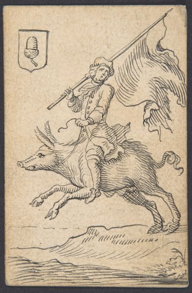 Curator: Here we have “Shield Knave: A Horseman,” a pen and brown ink drawing from the early 18th century, around 1712-1730, attributed to Johannes Brandenberg. Editor: It's a delightful little sketch, isn’t it? Somehow both jaunty and a little melancholy. The figure, all gesture and swish, riding atop this…is it a particularly spirited horse or just rather awkward? Curator: The charm lies, I think, in the linear economy and its baroque exuberance. Notice the hatching defining form, suggesting volume while retaining the flatness of the picture plane. Editor: You're right; there's a wonderful push and pull between detail and sketchiness. The way he uses the ink, it's like he's almost sculpting with it! But what about this rider? Is there a kind of performance happening in the portrait that isn't exactly captured here? He certainly looks pleased, yet stiff. Curator: The equestrian portrait has a rich history, often used to convey power, status. However, here, given Brandenberg’s typical light-hearted touch, I wonder if we’re seeing a gentle satire of these grand portrayals. Editor: Satire, definitely! He has a strange, slightly comical air that really contrasts the formal posture and dress. His horse, too, with that absurdly outstretched leg. Curator: Exactly. Consider also the landscape in the lower portion. Minimal, almost diagrammatic, but it provides just enough information to place our horseman in a wider world. Editor: But in this small work there’s this curious tension between grand ambition, with that touch of parody. What would it have been like, I wonder, to come across the individual portrayed within it. A little awkward and full of bravado, I bet. Curator: Precisely! Brandenberg has captured not just an image, but an essence, a suggestion of character. A little world in ink. It all adds to a rather delicious, and surprisingly subtle, drama.