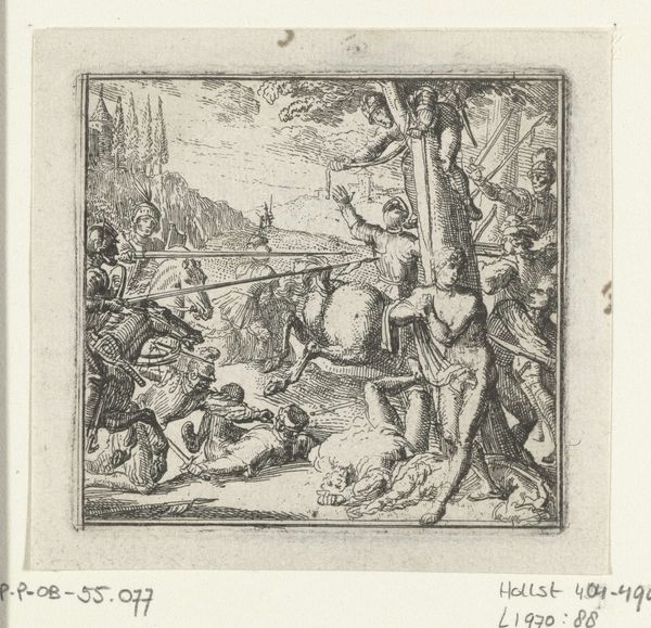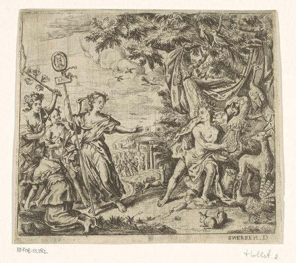 Curator: The first thing that grabs my attention here is this detailed rendering achieved through etching and engraving. It's an illustration from 1697 by Romeyn de Hooghe, part of Boccaccio's Decameron. Look at the precise lines creating depth, almost like a photograph of its time, it is almost mass-produced, given how detailed and accurate this etching of a story of Boccaccio's Decamerone is. Editor: It definitely has that handcrafted feel, even with the precision. What is it about the materiality of printmaking that's key here? Curator: Consider the labor. Engraving demands skill and time. De Hooghe was reproducing stories for a potentially wide audience. Print democratized narratives but required specialized knowledge and tools. The lines themselves aren't just depicting figures, they are evidence of a process, of the artist's hand guiding the burin. Where would such prints be consumed? In private homes, circulated in burgeoning literary circles, impacting moral judgements and values. Think about who had access to it? Editor: So, it’s about the spread of knowledge and the materials used in the service of culture? Curator: Exactly. And the accessibility granted to them. What would have been confined to wealthy circles can reach the merchants of the new age. The very act of printing becomes part of the story. It shifts artmaking from unique artworks to easily copied materials. Do you agree with this view? Editor: Yes, the idea that an artist can create something that anyone could have in their homes is a modern one, yet one of democratisation! Thanks, I never looked at it from that perspective! Curator: Considering art through the lens of materials helps unveil these hidden facets, doesn’t it? I never cease to enjoy printmaking's combination of replicability and the individual talent involved.