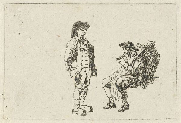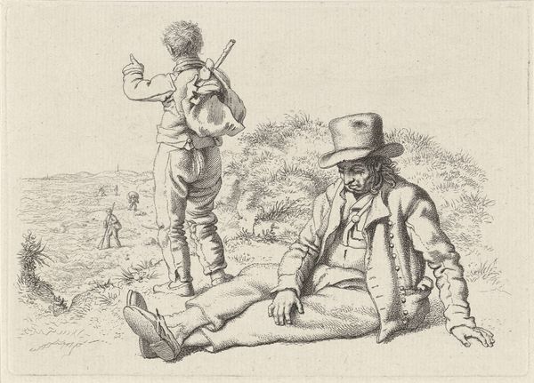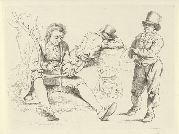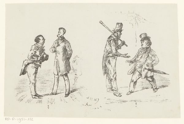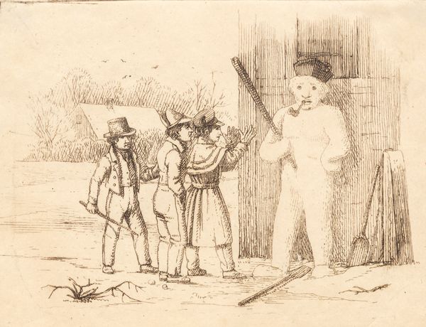 Curator: "Studieblad met vier figuren" or "Study Sheet with Four Figures" is a pen drawing on paper created by Jacob Ernst Marcus between 1808 and 1812. It's currently held here at the Rijksmuseum. Editor: It gives off a somewhat melancholy feeling, doesn’t it? A very muted color palette, thin strokes…almost fragile. I’d even describe it as slightly sparse in its overall effect, wouldn’t you agree? Curator: In terms of symbolism, the genre-painting captures the everyday activities of working people from the 19th century. The figures are placed without any specific arrangement in the picture. What meaning do you make from them? Editor: Compositionally, I'm most taken by the arrangement of the figures in a near horizontal line across the picture plane. This lends it a sense of both stasis and forward progression. There’s a certain clarity to it, wouldn’t you say? Also, it strikes me as the work explores several different approaches to figuration. I like how he articulates shape and form using line alone. Curator: The lack of color throws its emphasis into its subject as such. The pen and ink method used would also contribute to this emotional sparseness. You would be hard-pressed to represent raw emotion using such little artistic affect. In a time of war, this piece serves as a reminder of quiet days with simple folks working without much care in the world. The artwork, I suppose, carries a message of cultural continuity and the preservation of life's simplest aspects amid turbulence. Editor: Precisely. The contrast in postures and occupations between the figures makes me consider its potential narratives and social commentary. You said it was likely during wartime. So would this be a symbol of hope perhaps? Curator: Perhaps you are correct. In any case, Marcus successfully captured the temperamental mood and emotional underpinnings of everyday Dutch life. Editor: Indeed, there’s a captivating visual dynamic embedded in such a seemingly straightforward portrayal.