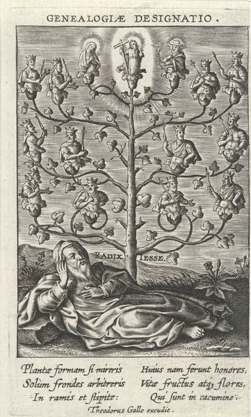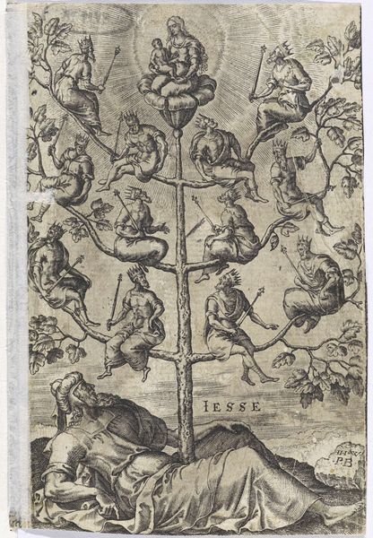 Christoffel van Sichem II created this woodcut print titled "Tree of Jesse" during the 17th century in the Netherlands, a period marked by religious and dynastic representation. The "Tree of Jesse" visually narrates the genealogy of Jesus Christ, tracing his lineage back to Jesse of Bethlehem. This imagery was particularly resonant during the Reformation when religious reformers challenged traditional representations. Sichem, working within this context, uses the traditional ‘tree’ format to communicate ancestry and authority by connecting figures of the Old Testament with the New Testament, specifically the Virgin Mary and Child at the top of the tree. Note how the figures—kings and prophets—are placed within the branches, illustrating a patriarchal lineage. The choice of the tree, deeply rooted yet branching upwards, symbolizes growth, heritage, and divine plan.
