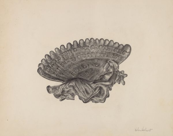 Curator: This is Mildred Ford's "Visiting Card Tray," created around 1941 using pencil and charcoal. Editor: My first impression is a certain gravity; the chiaroscuro feels somber and the composition, while simple, presents these cupped hands as carrying a heavy weight. Curator: The careful cross-hatching and blending, creating such tonal richness from graphite and charcoal, is quite remarkable. Notice how the artist utilizes a full spectrum of grays to mimic the form and texture of the original object. It is more than a drawing; it’s an intimate study of light and form. Editor: Indeed. The historical context of the artwork, being created in the early 1940s, cannot be ignored. During this time, many people felt a loss of identity and isolation caused by economic hardships, war, and cultural shifts. Does the offering of hands hold some significance, extending beyond their purely functional nature? Curator: Function is paramount here, as the artist clearly understood it: the structure is a solid base, becoming two palms that serve to gather. The slightly tilted angle draws our attention to the interior space of the palms. Editor: That very receptiveness can suggest a deep well of shared emotions in response to turbulent historical events; as viewers, we inherit its significance to question whose hands, or voices, were actually being welcomed at the doorstep during those fraught times? Curator: One might perceive an unspoken invitation or offering…but the drawing focuses acutely on the texture, form and rendering with high precision. Editor: I see a potential paradox, the tray being offered in peace while many injustices might exist within society that shape who gets to come in. Ford's drawing becomes less an object and more a window onto complex social narratives. Curator: Ultimately, one must commend Ford for their mastery of shading to render a familiar yet poignant drawing with basic material of pencil and charcoal. Editor: And for giving us cause to pause, reflecting both inwardly and outwardly on the delicate balances between offering, acceptance, and critical self-awareness.