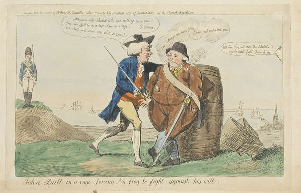 Curator: Let’s explore "Hernieuwde vriendschap tussen Nederland en Engeland, 1799," or "Renewed Friendship Between the Netherlands and England, 1799," a print possibly made in 1799 by Thomas Rowlandson, now housed at the Rijksmuseum. It employs engraving as its primary medium. What catches your eye first? Editor: It's chaotic! In the center, these two figures shaking hands seem almost dwarfed by the surrounding frenzy of retreating or collapsing figures. The expressions are also a standout. I want to understand who and what they all represent in this historical moment. Curator: The print, a caricature really, depicts the tentative reconciliation between England, symbolized by "honest Jack," and the Netherlands. Consider the materials—the paper, the ink, the engraved lines—each meticulously applied to create an easily reproduced image. Rowlandson created a satirical commentary accessible to a wide audience, critiquing the complex political and economic relationship. Editor: The social context is fascinating. After years of conflict during the French Revolutionary Wars, this print marks a brief period where the Dutch Stadtholder was restored with British support. But it's not a straightforward celebration. The surrounding figures are important—their frantic retreat hints at underlying tensions and instability of that renewed relationship. What can you say about the figure on the left with the bottle labeled "Holland's gin"? Curator: She exemplifies the stereotypical, caricatured image of a Dutch woman, doesn't she? Note her presence alongside the sailor. Here, we can look at how this piece implicates ideas surrounding Dutch mercantile interests, as well as British imports of this time, where it might be expected she offer tea, rather than gin! Editor: This gets into the layers of identity politics involved here: What narratives are being imposed and reinforced about the English versus the Dutch character and class status through image and text? I would guess these depictions were crafted specifically to fuel the nationalism that bolstered the war machine. The bags with the word "deceit" speak volumes! Curator: It's interesting how the medium of printmaking lent itself to such explicit propaganda, wasn't it? The relatively low cost of materials made it quite available for the era. The image allowed for quite a bold perspective of both national identity and social classes, readily digested and circulated, unlike fine painting available only to the wealthy. Editor: Absolutely. Examining the engraving and print itself alongside historical texts provides vital insight into how these ideas took root. This goes to show how social and economic structures were built, literally, with ink. Curator: This artwork is certainly an exemplar of its era's means for production. Editor: A great example of how we see a key historical moment through an artist's lens, complete with cultural and political subtext.