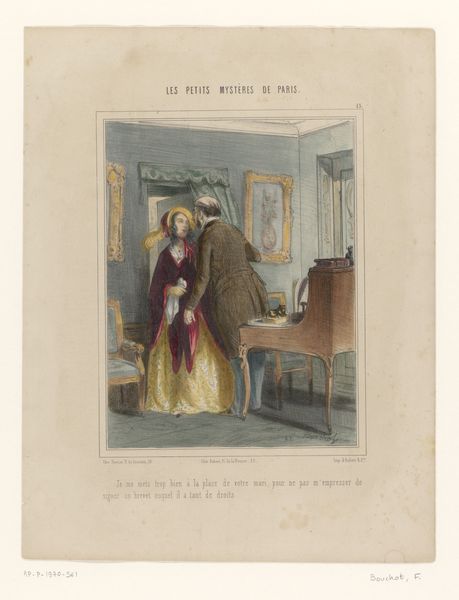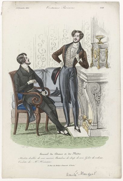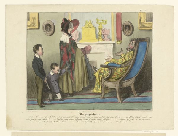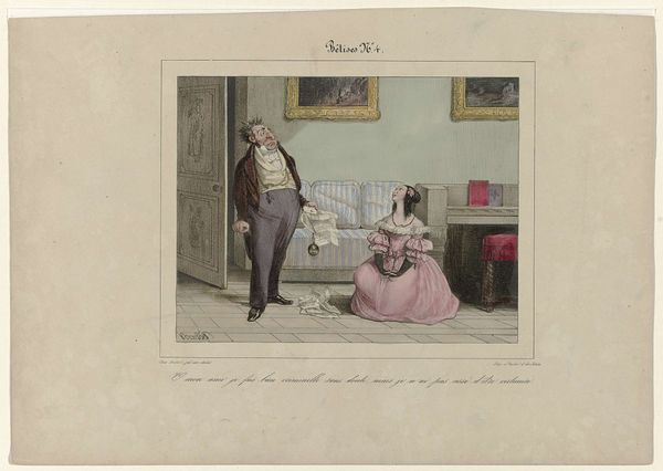 Editor: This is "Robert Macaire wijst uitnodiging af," or "Robert Macaire Refusing an Invitation," a lithograph made by Honoré Daumier in 1837, currently residing in the Rijksmuseum. There's a striking contrast in posture and expression between the reclining man and the standing figure; the whole thing seems subtly satirical. How do you interpret this work? Curator: The image is very telling about the social anxieties of the time. Daumier's "Robert Macaire" isn't just a portrait; it's a critique of the bourgeoisie in 19th-century France. The figure reclining is, in fact, Macaire, a fictional con man who represents the perceived deceit and moral corruption associated with the emerging middle class. Notice how the image plays with notions of respectability and social climbing through caricature. What does the setting suggest to you? Editor: The opulent decor suggests wealth and status. It feels like the artist is highlighting the materialism of the time. Curator: Exactly! And by having Macaire, a known swindler, in this setting, Daumier questions the very foundations of this wealth and status. Are these people truly virtuous, or are they, like Macaire, just skilled at presenting a convincing facade? Think about the impact this kind of imagery would have had in a society undergoing rapid social and economic change. The print served as a accessible and impactful form of social commentary. Editor: So, it's less about the individual and more about the broader societal critique? The role of art to reflect the historical environment from Daumier's critical perspective... Curator: Precisely. This piece encapsulates how art becomes a powerful tool to negotiate evolving public and social identities. Daumier’s satire invited viewers to critically examine the values of their society, a role that lithographs, distributed through newspapers and journals, played remarkably well. Editor: I hadn't considered the socio-political context so deeply. Thanks for shedding light on how Daumier used his art to comment on the shifts in 19th-century society.