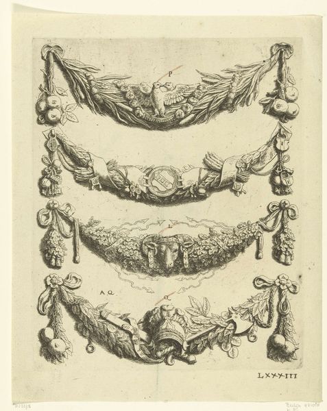 Curator: Look at these elegant flourishes! This engraving presents six designs for snuffboxes, crafted by Gabriel Huquier sometime between 1738 and 1749. Editor: My first impression is how incredibly ornate these are! Each design bursts with rococo extravagance. They practically scream wealth and luxury. What’s the scale like? Curator: Well, remember these are designs; the print itself allows for a controlled reproduction. The material of the boxes themselves would have varied, gold, silver, perhaps porcelain… materials easily molded. Think about the rising popularity of tobacco and snuff, it created an entire culture. The boxes became status symbols. Editor: Absolutely, these weren't just functional items. Huquier’s artistry and the engraver’s skill transform mundane objects into desirable commodities. It makes you think about the craftspeople involved and their expertise, compared to the aristocratic patrons. Curator: The baroque style definitely plays a role, but there’s something more here. We see the rise of design as its own category, pushing artisans and the decorative arts into a space for innovation and aspiration. Consider the way prints made these designs accessible beyond a single patron—potentially influencing craft production more widely. Editor: I'm fascinated by the line work and the incredible detail achieved through engraving. Each scroll, each shell, each tiny flourish would've taken immense skill and time to produce in the original object. And, obviously, even more labor in their design! It’s amazing how one is both repulsed and allured by the art. Curator: True. We see the birth of consumer culture, where design and accessibility began to collide in fascinating ways, shifting taste and dictating social trends. This engraving allows us to reflect upon how artistic vision was circulated. Editor: Exactly. Thinking about how an item’s cultural life extends through process and consumption makes all the difference. Curator: Indeed, tracing the origins and destinations of art allows us to understand how designs take flight and become objects of influence within specific circles. Editor: Well said! Seeing these designs, really emphasizes that interplay, doesn't it?