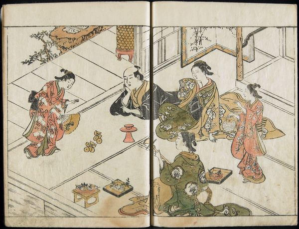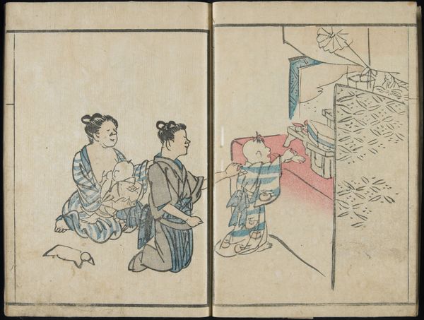 This diptych, *Prosperity of the Family*, was made as a woodblock print by Katsukawa Shunchō in Japan. It represents the family unit engaged in scholarly pursuits. The act of writing, seen here with women and children practicing calligraphy, has been a potent symbol across cultures. In ancient Egypt, scribes held immense power, their ability to record and preserve knowledge seen as almost divine. We find echoes of this reverence in medieval Europe, where monks meticulously copied manuscripts, preserving not only texts but also the very idea of continuity. The arrangement of the figures, each absorbed in their work, evokes a sense of harmony and shared purpose, tapping into our collective desire for familial connection and legacy. This scene transcends its specific time and place, resonating with universal human values.