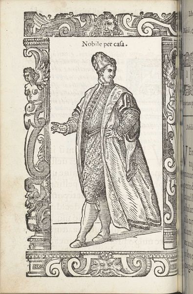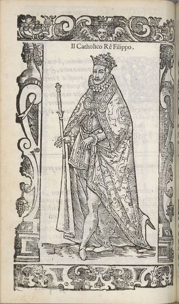 Curator: This engraving, "Duca di Firenza," crafted by Christoph Krieger around 1598, captures a figure of notable authority. Its stark black and white print gives it an immediacy that belies its age. Editor: The overall feel is undeniably rigid. His crown and sceptre immediately convey power, yet something about the Duke’s static pose and fixed expression renders the portrait almost mournful. What's your take? Curator: Well, engravings at this time involved a laborious process. Each line is etched into a metal plate. Think about the material constraints that shape this aesthetic—the pressure needed, the specific tools, the printing press itself! These choices reflect a deliberate distancing from painting's immediacy. Editor: That's fascinating from a maker's perspective. But I wonder, about the visual language employed? Crowns often symbolise divine right, while the fur trimmed cloak may imply luxury, however the lines create an impression of an almost otherworldly sadness, quite intriguing. Curator: Beyond symbolism, consider the socio-economic context! These printed images allowed for the widespread dissemination of power. The Duca's likeness could be multiplied and distributed, solidifying his image of authority amongst the masses through commodity production. It's power through reproducible means! Editor: Perhaps this is tied with the evolution of the idea of 'divine right' as the need to project that very image increases. I see the work also evokes visual tropes from both the Medieval and Mannerist movements - particularly its decorative aspects. The frame seems overflowing with motifs... a kind of visual density common for the era. Curator: Agreed. The ornamental frame emphasizes a culture obsessed with decoration and ostentation. This print wouldn't exist without skilled labor—the etchers, the printers, all playing a crucial part in distributing an aristocratic agenda through very precise work. Editor: So true; when looking at it through the lens of its original readership, we realise these carefully cultivated images served as cultural anchors for the era, constantly reaffirming established power structures, and embedding that culture through material means and in visual symbols. It's quite complex! Curator: Exactly. Understanding its context makes the image far more vibrant and unsettling! Editor: And through discussing it, even now! Thanks for sharing such unique angles.