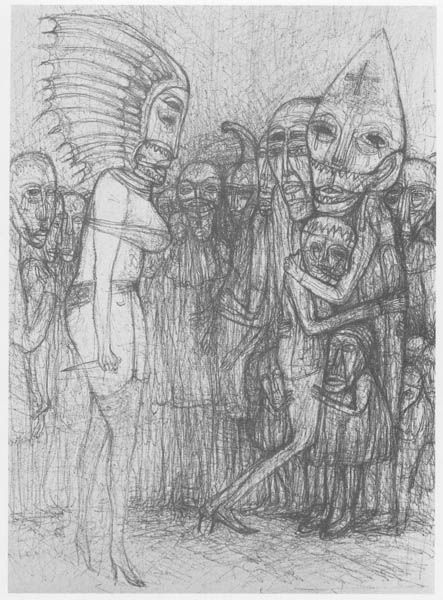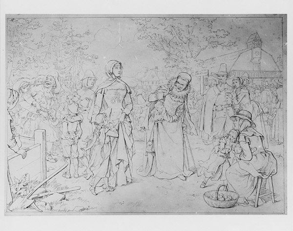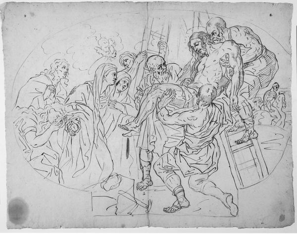 Curator: This drawing, "St. Bruno overgiver carteuserordenens regler til sine ordensbrødre," was created by Massimo Stanzione between 1630 and 1631. It's currently held here at the SMK, the National Gallery of Denmark. Editor: The somber tones of charcoal and pencil really set a mood of pious humility, don't they? The stark values lend a real sense of austere dedication. Curator: Absolutely. Stanzione situates us in a period where the church and religious orders played pivotal roles in society. St. Bruno, we see, is handing over the Carthusian order's rules to his brothers, thus solidifying institutional guidelines. The act itself reinforces a specific social hierarchy and devotion to religious structures. Editor: Visually, the drawing guides your eye through its skillful use of light and shadow. Notice how Stanzione employs delicate strokes to build volume and delineate the figures, giving particular attention to the faces. Curator: It’s important to also note the context of the Italian Renaissance from which it springs. Consider, for instance, the influence of the period’s humanistic values on Stanzione’s emphasis on representing human figures in a realistic and expressive manner. It mirrors shifts in religious iconography too, from stylized representation toward a more naturalistic portrayal of spiritual events. Editor: And the composition itself contributes to the solemnity, don’t you think? The arrangement directs attention to Bruno and the rules, while the slightly upward perspective further elevates St. Bruno’s significance within the scene. Curator: Precisely. That elevated placement directly emphasizes St. Bruno's spiritual authority. The scene becomes a representation of obedience and a reflection of the Carthusian order’s broader position within 17th-century religious and social strata. Editor: Ultimately, what resonates with me is how these deliberate formal choices invite contemplation on matters of faith and obedience, a quality achieved through masterful use of fundamental techniques. Curator: And what intrigues me is how this single image encapsulates so much about the power structures of the time and the role of religious imagery in reinforcing them.