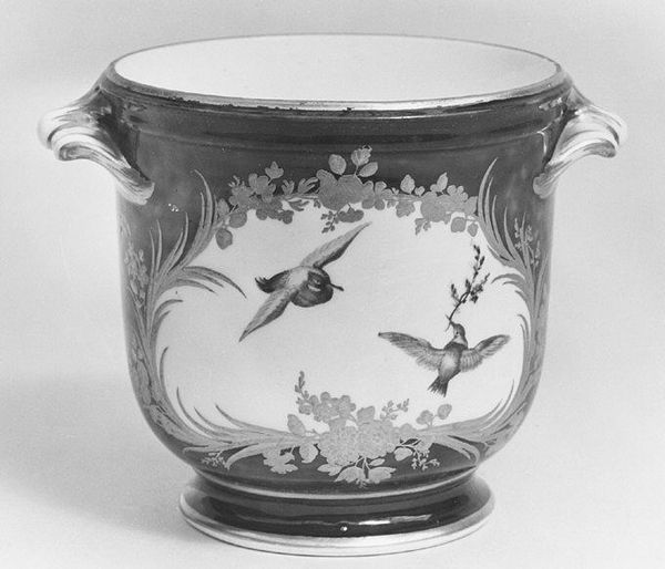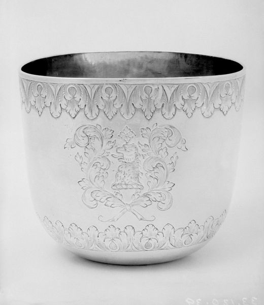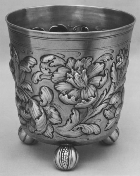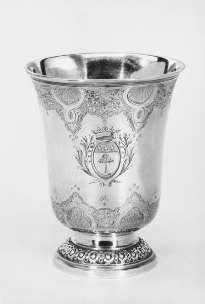 Curator: This striking silver beaker dates to 1687-1688 and is currently held at The Metropolitan Museum of Art. Note the engraved floral decoration. Editor: It’s a curious piece, almost austere, despite the floral motifs. The octagonal form gives it a rigid structure that seems at odds with the organic, flowing engravings. Curator: That tension is key, isn’t it? Consider the social context; silverwork like this wasn't merely decorative. Its value reflected the owner's status and played a role in displaying wealth and taste. The act of producing something like this was time intensive. Who was it produced for, and who labored to create it? Editor: Right, but look closer at the individual panels. Each flower, distinct in its rendering, invites the eye to circle the piece. There’s a rhythmic quality, an implied narrative created through these repeating, yet individualized forms. The material shines even in grayscale! Curator: Agreed. Silver's malleability made this type of intricate detailing possible. Each mark is a result of craft and control—both physically from the person doing the engraving, and as a representation of a controlled form of power from the one commissioning the work. What could they be drinking from it, though? Was it wine, or mead? Editor: Good point, but the flowers themselves might provide clues as to other symbolic references of nature and opulence. It would require deep visual analysis and a closer study of their semiotics, and it's a very appealing topic to examine and to study for that very reason. Curator: True. Reflecting on this object, it's fascinating to trace how this simple utilitarian form becomes so intricately tied to production, class, and display. Editor: And through formal elements such as the octagonal shape and floral arrangements, to consider its intrinsic artistic statement. The way it simultaneously resists and invites adornment is quite brilliant.