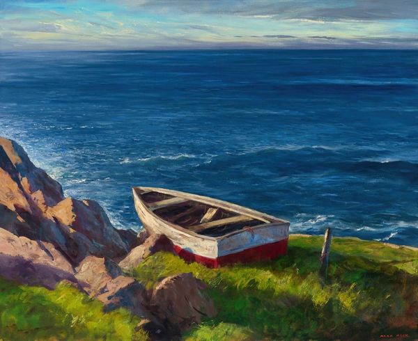 Rockwell Kent made this painting of a Maine lobsterman, and the ocean he works on, probably sometime in the first half of the 20th Century. The blending is so smooth, it’s hard to see the brushstrokes, making it feel like the scene just appeared, almost magically, on the canvas. Look at the way Kent builds up the image with layers of color, those blues, greens, and browns feel so solid. The rocks in the foreground are painted in such a way that you can almost feel their weight and coolness. Then your eye travels to the lobsterman, a tiny figure in a small boat, amidst this vast landscape, he’s somehow dwarfed and yet holding his own. Kent's earlier, more graphic style reminds me of woodcuts. Maybe he was thinking about the sea, and also the history of American painting - like Winslow Homer? Anyway, this work embodies art as an exchange of ideas across time, inviting multiple interpretations.