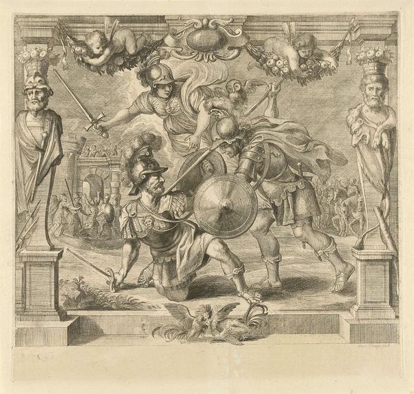 This engraving by Hubert Quellinus depicts a relief on the rear facade of the Stadhuis op de Dam. The triangular composition is densely packed with figures, creating a rich interplay of light and shadow. The detailed linework captures the texture of the sculptural relief, giving the impression of depth and movement within the static form. The engraving employs a classical architectural element, the tympanum, to frame a complex allegory. The symmetrical arrangement of figures around a central figure suggests a carefully structured narrative. Yet, the profusion of detail and the dynamic poses of the figures introduce a sense of baroque exuberance, destabilizing the classical order. Note how the artist uses the formal constraints of the triangular shape to create a dynamic interplay between order and chaos, inviting us to decode its cultural and philosophical discourse. This tension reflects a broader artistic concern with reconciling classical ideals with the baroque sensibility of the time, engaging in a dialogue that continues to shape our understanding of art and its place in society.