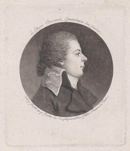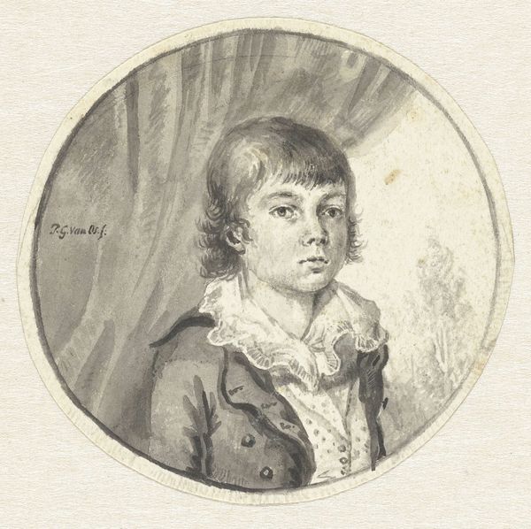 Curator: Here we have a work entitled "Portret van Willem Grebner," estimated to have been created sometime between 1800 and 1830. The medium appears to be graphite and charcoal on paper. Editor: It has a kind of austere charm, doesn't it? There's a subdued, almost ghostly quality in the subject's face, emphasized by the monochromatic tones. Curator: Indeed. The oval format reinforces the tradition of portraiture, channeling a certain timelessness. The artist uses subtle gradations of tone to define form. Note how the light falls to create a sense of volume. Editor: Yes, but look closely at the application of materials; you can see individual strokes, the hand of the artist quite literally *in* the making of this portrait. I imagine the artist painstakingly building up the shadows with charcoal dust, perhaps even using a cloth or soft tool to soften the harsher edges, thus allowing light to describe contours smoothly. Curator: Precisely. It’s also important to acknowledge how the Romantic era informs its visual rhetoric; you have elements of naturalism married to emotional expression. Grebner's composed gaze projects an intensity, reflective perhaps of the shifting political landscapes of that time. Editor: Or perhaps we’re seeing the hand of commerce here? Commissioned portraits were a source of revenue, so the quick application of materials speaks to practical economy: time saved could generate profits. Graphite and charcoal were much less costly than oil paints. What sort of economic pressures influenced Grebner to be portrayed in charcoal rather than more lavish, pricier media? Curator: An interesting avenue for thought. And consider how this piece transcends mere representational depiction, acting instead as a symbol of social and personal identity formation at the threshold of modernity. It raises fundamental issues of portraiture as visual form. Editor: Maybe so. For me though, the true revelation resides within that visible act: smudging, stroking, blending until it’s done… It suggests both intention and execution within socio-economic contexts! I'm captivated by how our subject becomes *visible* only after such artful toil. Curator: A compelling articulation indeed. I find I look more at the structure and composition as defining visual signifiers. Editor: Well said.