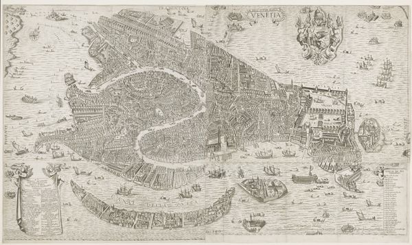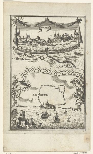 Curator: We’re looking at “Kaart van de Waal en een gezicht op Schenckenschans,” created by Claes Jansz. Visscher around 1635 to 1636. It's a print, specifically an engraving. Editor: My first impression? It feels strangely… authoritative. Like an old document, a map with secrets. I'm immediately drawn to all the tiny figures populating the landscape, their lives caught in this web of lines. Curator: Authority is an interesting term to use here, and indeed relevant. Formally, notice how Visscher uses precise lines to create a dual perspective: a bird’s-eye view of the Waal river and a detailed depiction of Schenckenschans fortress below. Editor: It's like two different worlds layered on top of each other, history and geography, but each with an uncanny feeling. The upper register reminds me of peering down from a hot air balloon. What about that odd array of weaponry and regalia draped at the join, framing Schenckenschans. It’s so tactile despite being an engraving. Curator: That "tactile" quality speaks to Visscher's skill with engraving, which can create tonal variation by creating higher or lower relief when pressing the print plate onto the paper. It acts as a sort of *vanitas* in its overt military symbolism. The combination of weaponry, flags and cartographical accuracy underscore a historical moment frozen in time. Consider the formal repetition in how the rivers meander mirroring the shape of the military paraphernalia above the horizon of the city-fortress in the lower half. Editor: It is melancholic but so well articulated by these careful lines! Do you get a sense of loss, the weight of history, as though something’s about to be contested? The perspective is not exact but idealized, as though he’s trying to present us with an *idea* of order. The fortress rendered as safe haven with activity teeming inside and around the embankments in smaller ships. The location’s destiny seems suspended somewhere between the bird’s-eye-view of cartography, with its overview and the human dramas about to play out. Curator: Exactly! The tension between objectivity and lived experience defines the piece. Formally the detailed line work emphasizes not just physical geography but the underlying political landscape of the Dutch Golden Age. Editor: This feels like an exercise in seeing and reading a city, both as a real place, but also as something constructed. I am impressed by what we could imagine was happening in the foreground just before this “snapshot.” So much conflict just beyond the edges. Curator: Absolutely, what a masterful play of line, perspective and historical weight. Editor: The level of observation achieved through lines creates such a world.