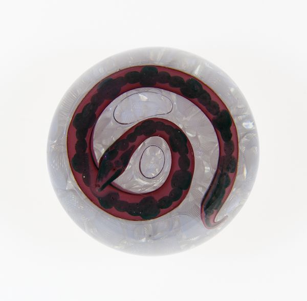 Curator: Editor: This is "Paperweight" made between 1848 and 1855 by the Compagnie de Saint Louis, a stunning glass sculpture held at the Art Institute of Chicago. I am particularly struck by the eerie feeling that it has. What is your view of the piece? Curator: Let's consider the context. The intense labor involved in glass production, the careful shaping, the precise encasement of that snake—it speaks to me about control. What purpose does that control serve, I wonder? It’s a memento, a captured moment in time, but for whom? And who had access to these luxuries crafted by unseen hands? Editor: That's a point, there's quite an abundance of invisible labor here! Could this object have been intended as a display of status then, or a scientific specimen, perhaps? Curator: Precisely. Reflect on how glass, as a material, moves from sand—common, mundane—to refined transparency through a volatile process. Is the snake elevated, preserved, or imprisoned? Notice how the snake form challenges the perfectly crafted geometry of the glass. It’s not just decorative; it provokes. What ideas do you believe it's trying to provoke? Editor: I now find myself pondering the ethics surrounding such crafted displays, not only from a design standpoint but from that of societal imbalances, class divides, and consumption overall! Curator: And there we arrive at the core: a pretty object obscuring complex networks of production, power, and privilege. Editor: I'll definitely view decorative art in a very different light from now on!