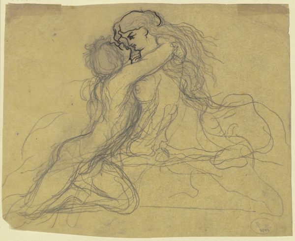 Curator: The ink rendering of "Woman's Dream" by Wilhelm Lehmbruck, dating to 1914, presents us with an intriguing image. Editor: Yes, there is a fragile beauty, like a faded memory. I'm drawn to the subject's downcast gaze and closed eyes. Is this vulnerability or a deeper self-possession? Curator: Perhaps both? Lehmbruck, known for his sculpture, often infused his figures with an inner life. Consider the traditional symbolic weight associated with closed eyes across different cultures - a descent into the self. Editor: Exactly, and in 1914, on the cusp of such brutal historical upheaval, a retreat inwards speaks volumes. The woman’s nudity also situates her, exposing social ideas concerning women's identity. Curator: It’s certainly there, rendered with very visible hatched strokes that could be interpreted as expressive of the fracturing of social norms and inner thoughts through that time. The rapid lines almost feel incomplete, like fragmented cultural symbols or perhaps psychological aspects rising and falling into perception. Editor: These fragmented strokes lend it a quality that invites projection, it encourages a response to that vulnerability. A woman’s dream could be about personal aspiration and freedom, but in the light of Lehmbruck and the date the questions are, what were women free to do? To what could they aspire? The line between liberation and imposed narrative becomes indistinct. Curator: And we see that tension rendered visually through the medium of printmaking, so traditionally available but imbued with a style leaning heavily on subjective experience of a modern world. A delicate but intense dream world crafted using techniques that reach across centuries of social development. Editor: Which brings the personal and the historical so intimately close together, prompting questions about the representation of the feminine experience. Curator: Absolutely, I find it a work where Lehmbruck evokes timeless emotional narratives that feel distinctly urgent as well. Editor: A timely and thought provoking point.