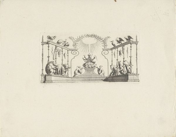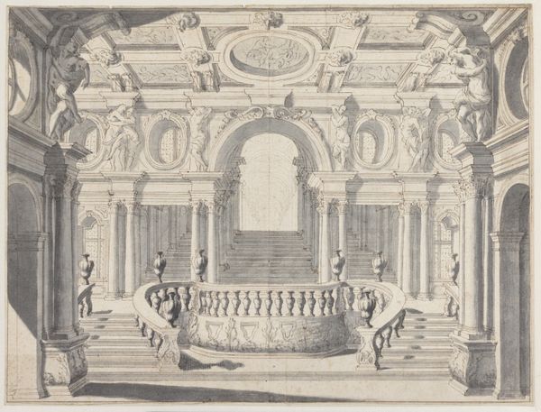 Luigi Vanvitelli made this ink on paper drawing of the Small Theater at the Palace of Caserta, a royal residence near Naples. Vanvitelli, as an architect and engineer, was concerned with the precise depiction of form and space. The drawing's visual quality is achieved through methodical linework and hatching. Observe the intricate details of the theater's architecture, from the grand arches to the ornate columns. The stage design offers a glimpse into the world of theatrical illusion, with its painted backdrops and carefully arranged props. Consider the work involved in the production of such a drawing. It's a testament to the skills of the draftsman, whose expertise was essential for communicating design ideas. But the drawing also speaks to the labor that would have been required to realize Vanvitelli's vision in built form. Craft, design, and materiality all intersect, and we see the amount of work that went into the production process. Ultimately, this drawing invites us to appreciate the interplay between artistic representation, architectural design, and the broader context of labor and production.