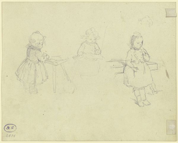 Editor: Here we have "Old Woman in Front of a Chair," a pencil drawing from around 1900 by Gustav Schraegle, housed at the Städel Museum. The quick lines and rather domestic scene give it an intimate feel, almost like glimpsing a private moment. What catches your eye when you look at this piece? Curator: It's funny you say private moment. Schraegle's work often gives me that same sense of quiet observation. Look at how the pencil strokes aren't labored but rather feel almost like a memory being quickly sketched down. It’s like he is trying to capture the feeling, more than precise visual information. The open, somewhat incomplete areas feel pregnant with unsaid stories. You wonder about this woman and those surrounding her. Are they even related? Editor: That makes me see the roughness of the sketch in a new way. It almost gives the drawing a kind of vulnerability, since nothing feels too precious or labored. What about the placement of the figures – how does that impact the drawing's story? Curator: The arrangement definitely adds to it! See how the figures almost appear compressed into a rectangular 'stage'? It adds a playful theatricality, almost mocking genre painting of the time. Is that humor or what? He could be asking us whether capturing 'real life' in art is just us constructing fictions, like theater… but it’s still just an amazing and emotional sketch! Editor: I didn't consider that theatrical element, but I see it now! Thanks. It's interesting to think that what I first perceived as a simple drawing might be engaging with such bigger questions. Curator: Isn’t that wonderful? Sometimes a simple sketch holds worlds. The humblest medium with the biggest ideas!