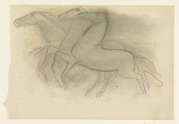 Editor: We're looking at Leonardo da Vinci's "A Study for an Equestrian Monument," created around 1490 using pencil. The dynamism captured in this sketch is incredible; you can really feel the energy of the horse rearing. How do you interpret this work, focusing on its formal elements? Curator: The most striking aspect of this work is da Vinci’s mastery of line and form. Notice the hatching and cross-hatching. How does the density of lines affect your perception of the horse's volume and musculature? Editor: It's amazing! The darker areas really make the horse feel three-dimensional, even though it’s just a sketch. The lines create such a strong sense of depth and mass. Curator: Precisely. Also, consider the composition. The upward thrust of the horse is counterbalanced by the implied horizontal of the rider's arm, creating a visual tension. Observe how da Vinci uses implied lines to guide the viewer's eye, even in unfinished areas. What effect does this have? Editor: I think it pulls you in; your eyes fill in the gaps and participate in the creation of the image. It's engaging rather than static. Curator: An excellent point. The sketch's unfinished quality underscores the dynamism and movement; It is about potential energy rather than resolved form. Editor: Seeing it this way makes me appreciate how much the form contributes to the work’s overall energy and power, even beyond the subject matter itself. Curator: And that understanding comes from a careful analysis of the elements within the artwork. By considering how these elements operate, one discovers how it is affecting how we feel, how we react.