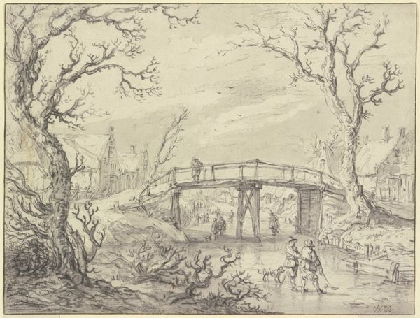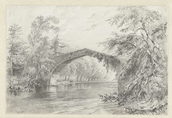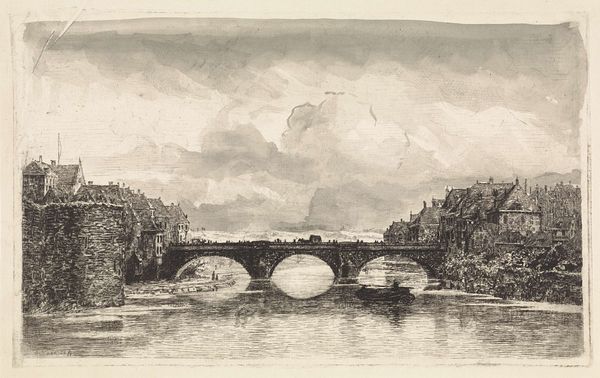 Curator: Elias Stark’s “Bridge over the Fulda in Kassel," likely created in 1888, offers us a glimpse into late 19th-century urban life through the precise medium of etching. It’s held here at the Rijksmuseum. Editor: My immediate impression is how delicate and almost dreamlike it is. The texture achieved through etching gives a beautiful depth. The bridge is central, but there's a remarkable stillness in the water’s reflection. Curator: Yes, it really captures the burgeoning industrial era juxtaposed with the everyday lives of those crossing the bridge. The bridge, an imposing structure in itself, becomes a connector, a site of transit, and the lifeblood of Kassel. Consider who crosses this bridge: merchants, workers, families...their stories etched in the image through implication. Editor: Precisely. And it's not just who crosses it, but *how* the bridge was constructed and the materials used—likely sourced and manufactured locally. We can also think about the labor that went into not just its construction, but the maintenance and upkeep, which provided sustenance to local tradespeople. What can we infer about class divisions, about who gets to partake in leisure? Curator: The cityscape looming behind, the architectural choices of that time—they indicate societal values and aspirations. It portrays an age of expansion, industrial revolution, yet it subtly hints at the stark contrasts within society at the time. Editor: Absolutely. Also, by representing this subject matter using etching rather than painting or sculpture makes a statement about how to produce art at this historical juncture. This was art that could be easily and widely reproduced. Curator: Stark perhaps democratized city views, disseminating this vista to a wider audience via printmaking and making it more accessible to all social classes. That decision, by itself, opens doors to understanding late nineteenth-century Europe, bridging gaps in cultural narratives through one image. Editor: Agreed, viewing the processes behind art alongside these details is just as important as considering the subject of art. Now I wonder what changes we might observe if we could compare Stark's cityscape with views of the bridge over time through present-day.