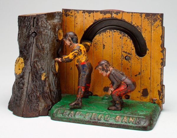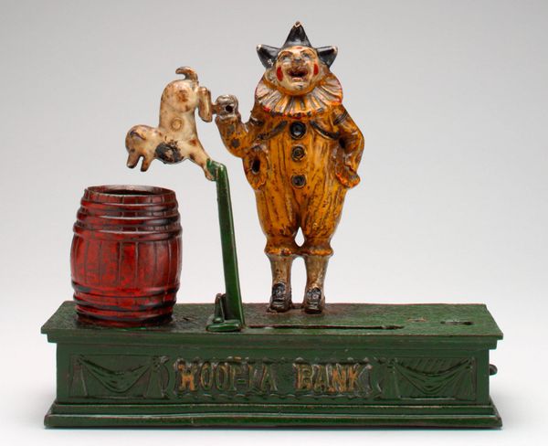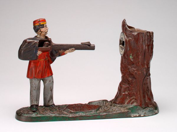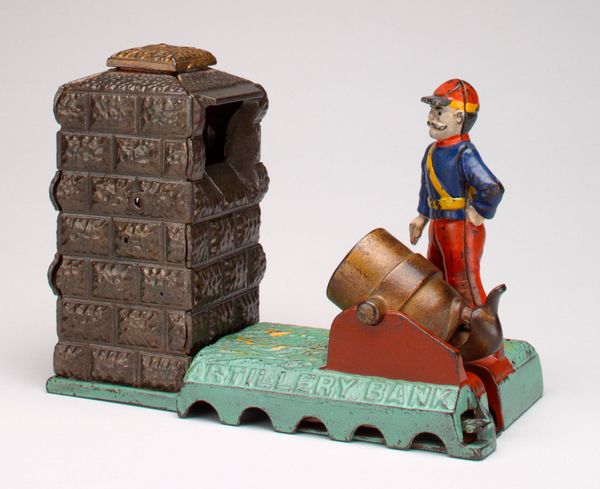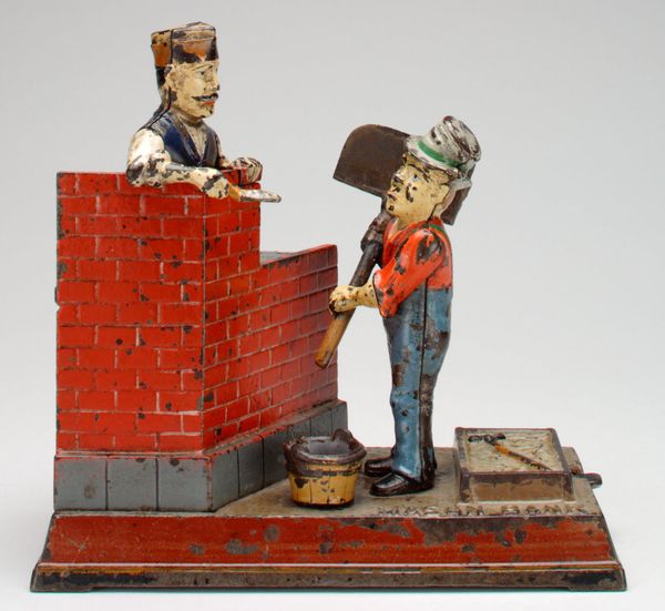 Editor: This is "-Santa Claus- mechanical bank," dating to about 1889. It's made of metal, and seeing it in person, you can really appreciate the small scale and aged texture of the piece. I’m struck by the directness and, honestly, the somewhat crude representation of Santa Claus. What can you tell me about it? Curator: Let's consider first the structural aspects. Notice how the artist, likely an anonymous craftsman, has juxtaposed the static, brick-like form of the chimney with the slightly cartoonish, yet dynamic figure of Santa. The surface itself—the distressed paint—becomes part of the narrative. Does it not suggest age, use, perhaps even a forgotten Christmas past? Editor: It definitely feels well-worn. I suppose that's intentional. Curator: The use of metal allows for a robustness, a physical presence. It's not merely decorative; it’s functional, as a mechanical bank, indicating an interaction and a certain expectation of durability. How does the interaction between the colours inform your reading of the object? Editor: Red is definitely dominant, with the chimney. And Santa himself has red on the hat, of course, but the grey or muted colours elsewhere, I guess I feel, add contrast? Curator: Precisely! This dichotomy creates a certain tension within the object, pitting the vitality and urgency of the deposit—the insertion of coins—against the potentially somber recollection of what is saved. Are we to think here about the function of saving for the future as some version of foregoing pleasures today? Editor: Hmmm... that does make you consider saving versus spending! Thank you—I hadn't looked at it that way at all. Curator: One learns that every structural detail is critical to decoding its layered meanings, the play of materiality, colour, and the forms’ configuration as more than an antique but as an artefact that opens questions about deferred or future gratification.