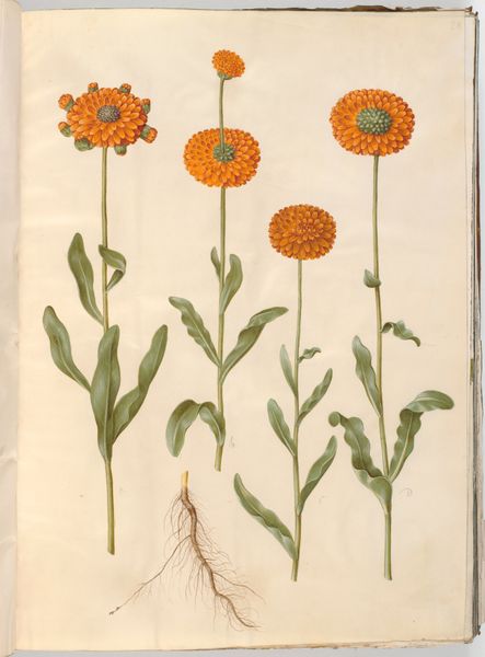 Hans Simon Holtzbecker made this depiction of Calendula officinalis, or the pot marigold, in the 17th century. It is part of a detailed study of plant life. The work reflects the growing scientific interest in botany during the period, but we might also consider the social and economic factors that shaped its creation. Holtzbecker was working in Denmark, where the royal court was deeply invested in scientific and artistic pursuits. Botanical illustrations were not merely scientific records; they were also symbols of wealth, knowledge, and power. The level of detail and accuracy suggests that this work was intended for a learned audience, perhaps connected to a university or the court. The choice of the pot marigold, a common but useful plant, hints at an interest in the practical applications of botany, such as medicine. To truly understand the image, we must consider the social structures of 17th-century Denmark, as well as the institutions that supported artistic and scientific production.