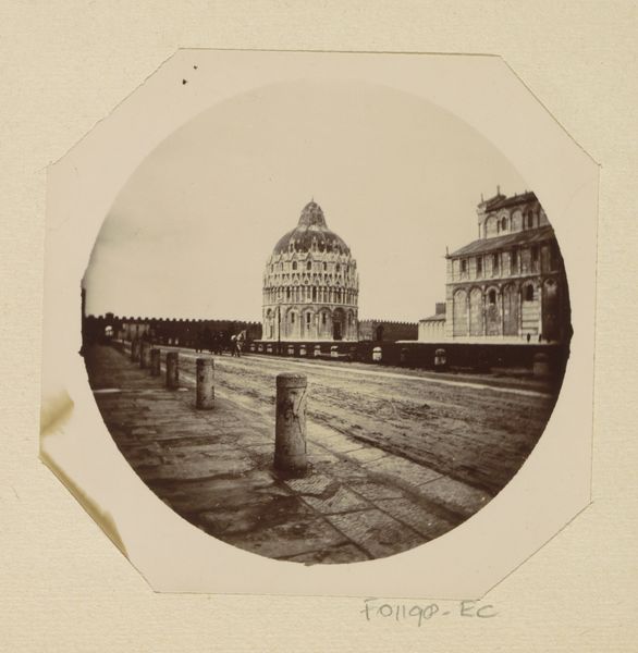 Editor: This is a photograph titled "Piazza dei Miracoli in Pisa met links de kathedraal en rechts de Toren van Pisa" by Johanna Margaretha Piek, dating from around 1889 to 1893. It’s a gelatin silver print, giving it that lovely sepia tone. The composition, with the cathedral and leaning tower framing the open piazza, feels so deliberately arranged. What do you see as the most important formal element in this image? Curator: The immediate emphasis resides within the spatial relationship manifested. Piek utilizes the circular crop to concentrate the architectural forms, thus inviting inquiry into the relation between the photographic surface and the illusory depth it manifests. Note the tonal gradation and the deliberate placement of the figure within the foreground; these elements reinforce the geometric interplay, wouldn’t you agree? Editor: Absolutely. The placement of the figure adds a sense of scale. It prevents the buildings from overwhelming the picture and provides a focal point within this expansive space. Given its inherent qualities, does this image subvert the established standards of Realism? Curator: The adherence to realism is less about mimicking visible reality and more about using perspective and light to construct a coherent visual system. Look closely at the surfaces of the structures, and you can almost feel the roughness of the stone in the photographic grain. It’s an exercise in pictorial construction, not mere representation. The geometry, therefore, structures the real. Editor: That's interesting. So, instead of seeing it as a simple depiction of a place, we can view it as a commentary on space and form itself, utilizing realism merely as a technical vehicle. Curator: Precisely. Through this approach, we unlock deeper engagement with the art, viewing beyond the depicted to decode the fundamental principles governing its composition. Editor: Well, I’ll certainly look at photography differently from now on! I’ve realized how photographic framing creates a geometry with strong structural qualities. Thank you for elucidating this work and Johanna Margaretha Piek’s practice through a Formalist lens. Curator: Indeed, the careful considerations of light, shape, and form reveal a complexity within realism. I will endeavor to engage in a deeper observation and interrogation of geometrical shapes and tonal ranges as well.