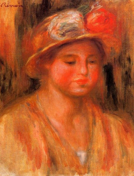 Pierre-Auguste Renoir captured this Woman's Head with oil on canvas, and the floral motifs swirling in the background behind the subject give us a glimpse into the visual language of his time. Consider the rose, a symbol deeply entwined with Venus, the Roman goddess of love and beauty, and by extension, the Virgin Mary. This flower, seen throughout history, is charged with layers of meaning, from purity to passion. We find it in Botticelli's "Birth of Venus," where roses rain down, and later, in Pre-Raphaelite works, each time accruing new connotations. Now observe the woman's rounded face and contemplative gaze, a classical motif echoing portraits from the Renaissance. There's a softness that stirs something primal in us, a yearning for beauty. This motif has appeared in many works throughout history, undergoing a constant metamorphosis, taking on new cultural and emotional meanings as it resurfaces, echoing our collective memories.