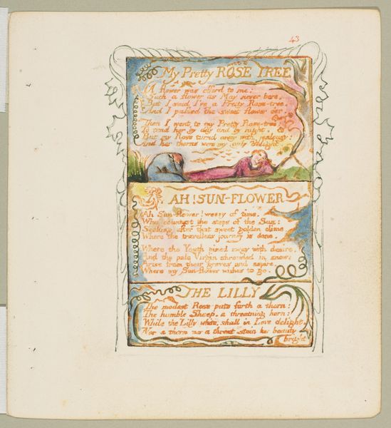 This is William Blake's "A Dream" from Songs of Innocence, printed using illuminated etching, a technique perfected by Blake around 1789. The poem, framed by swirling tendrils, immediately draws us into a world where the visual and textual intertwine. The script-like font, illuminated with touches of gold and blue, dances across the page, mirroring the poem's exploration of innocence and experience. Blake uses the interplay of organic forms and linear text to destabilize the traditional relationship between word and image. Note how the lines, colors, and shapes create a semiotic system in which each element functions as a signifier. The dreamlike state evoked is not merely illustrated but embodied in the very structure of the artwork. Blake uses an innovative approach to book production to challenge conventional modes of perception. This piece isn't just a poem; it's a visual and intellectual experience.