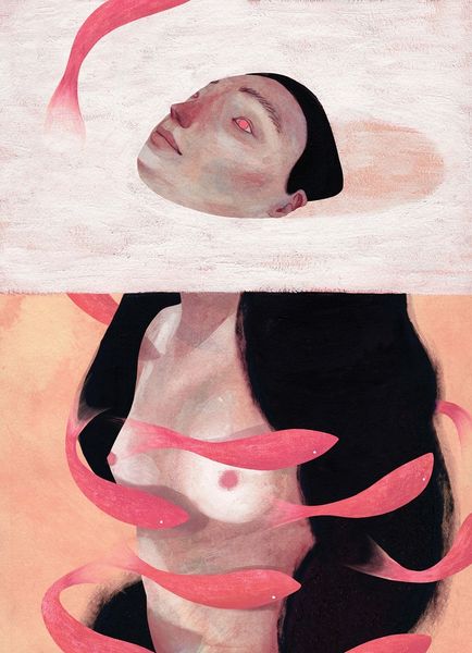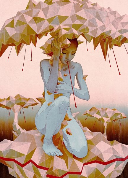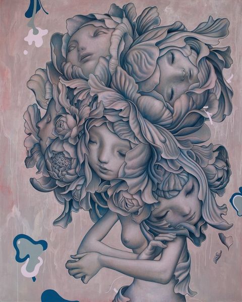 James Jean, born in 1979, painted ‘Sculptor’ using layered brushstrokes of acrylic and oil paint. He then added delicate details in graphite, creating an ethereal, dreamlike image. The painting depicts a nude female figure diligently carving into a large, amorphous stone. Her tools—a mallet and chisel—are traditional, yet the cascading drips of paint and gilding lend the work a contemporary feel. Jean expertly balances the textures of the rough stone with the smooth skin of the figure, and incorporates elements of natural beauty such as birds, butterflies, and flowering motifs, all enhanced by the flat, decorative application of gold leaf. The labor-intensive process mirrors the act of sculpting itself, requiring precision, patience, and skill. By combining meticulous technique with surreal imagery, Jean blurs the boundaries between fine art and illustration, and challenges conventional notions about artistic value and the creative process.