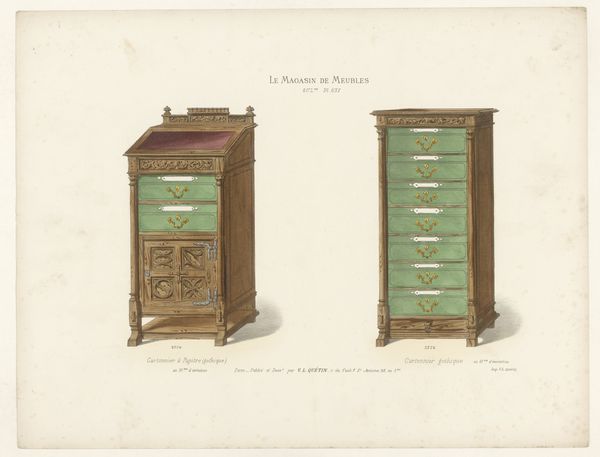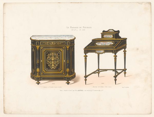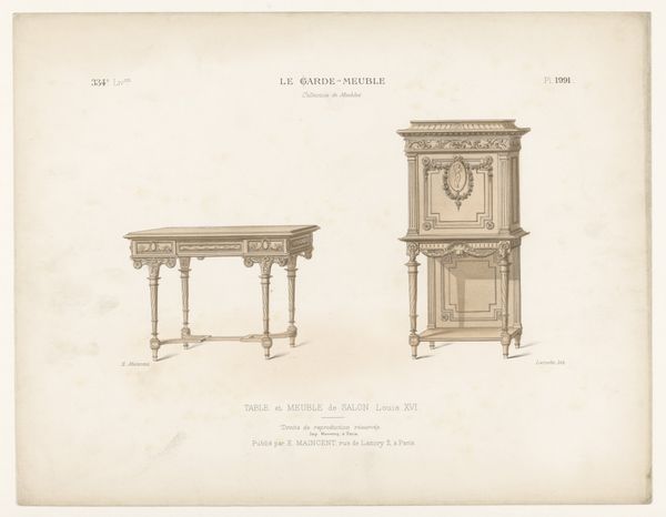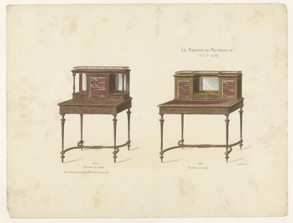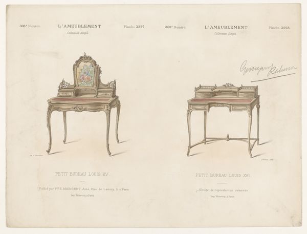 Curator: Here we have "Twee bureaus" – Two Desks – an 1895 watercolor drawing and print by Léon Laroche. Two strikingly similar yet distinct desk designs face us. Editor: My initial reaction is of poised elegance and meticulous detail; the colour palette evokes serenity, don’t you think? The gentle shading makes them look like phantom thoughts about desks, rather than actual, functional objects. Curator: Indeed. It's interesting to consider these renderings within the context of late 19th-century decorative arts. Mass production was altering furniture design, so presentation became key. This print was likely intended to illustrate options in an interior design catalogue or advertisement. These bureaus offered access to the styles of past royalty and powerful elite of Europe’s past. Editor: Focusing on form, notice the contrast between the geometric rigour and that restrained ornamentation. These details direct the eye around the structures—a carefully orchestrated visual dance that offers multiple readings. We observe, for instance, a dialogue between verticality and horizontality; notice also the careful counter positioning of each element within the desk frame. Curator: Precisely. It's not just about presenting furniture. The publication information implies a larger network of producers, distributors and consumers operating in Parisian decorative art trades. One has to wonder who was targeted in their marketing practices. This image offers a glimpse into both aesthetic and business strategies. Editor: Considering it merely as lines, planes and surfaces yields much value, too. Observe how space is activated, how our gazes are engaged via tonal transitions; then consider line quality… Laroche displays a virtuoso grasp. Curator: A convincing argument indeed, in examining it structurally you remind me that these weren’t mere furniture pieces. The image itself suggests aspiration, embodying specific ideals of status and historical association during a period of considerable social transformation. Editor: So, from form to meaning, we each discover nuanced insights by looking deeper. Curator: Absolutely. An object lesson perhaps on seeing with new eyes in fresh light.