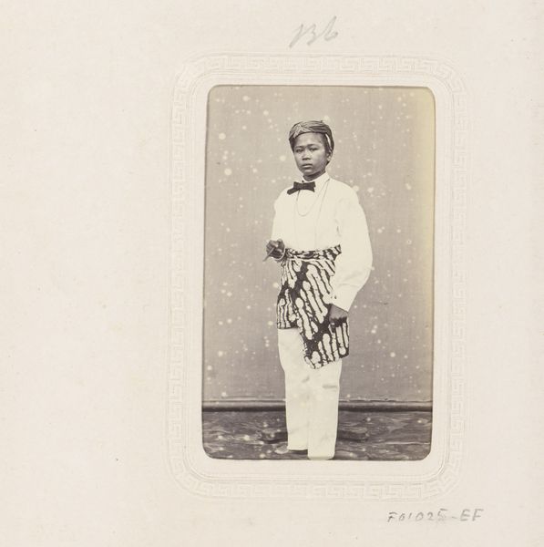 This is a portrait of an Indonesian man with spear and headdress, captured in a photograph by Woodbury & Page. This portrait exists within a longer history of colonial encounters where photography was strategically used to document, classify, and represent colonized people. In many ways, the portrait flattens the identity of this Indonesian man. His elaborate headdress and spear may signify important cultural or social roles within his community, yet these details run the risk of being consumed as exotic spectacle divorced from the real man. Consider, for instance, how this image might be used to reinforce Western notions of the “other,” or to justify colonial power dynamics. How might we re-insert agency and dignity into this image, recognizing the individual beyond the frame of colonial representation?