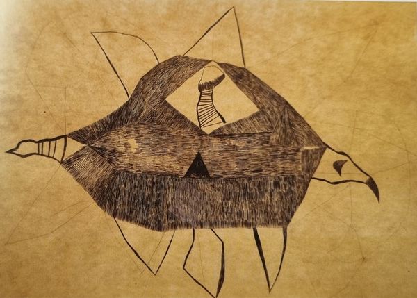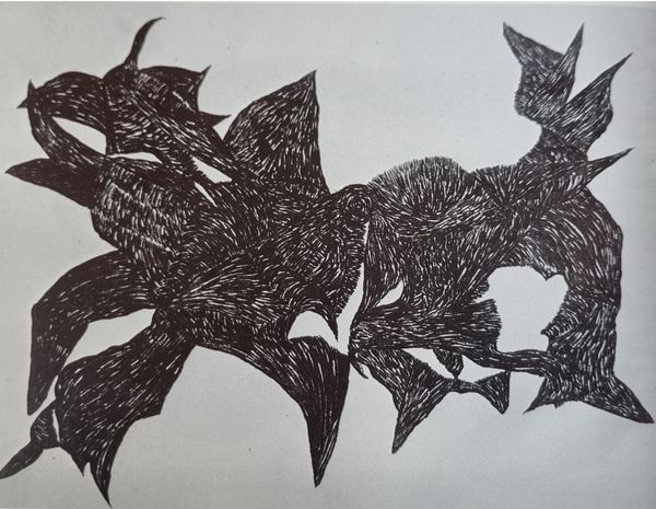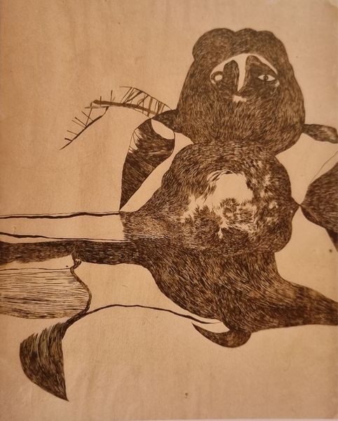 Curator: Sobering. At first glance, the starkness of the lines evokes a sense of solemnity. It almost feels like witnessing an unearthing. Editor: I'd like to introduce "Bird with Translucent Body" by Vajda Lajos, created in 1939 using Indian ink on paper. Its dimensions are 90 by 63.4 centimeters. Lajos, a key figure in Hungarian modernism, frequently explored themes of duality and transformation. Curator: That duality you mention feels palpable. The bird-like form is present, yet its body seems almost ghost-like, revealing an unsettling inner landscape. I see the merging of animal and human-like features. How can this unsettling imagery be interpreted within its historical context? Editor: Considering its creation just before World War II, one can view it as a response to mounting anxieties and the fracturing of societal structures. The translucent body might represent the fragility of life, or the loss of innocence. Lajos was deeply affected by personal tragedy and societal upheaval, that certainly shaped his artistic vision. Curator: His style is rooted in symbolism, right? Are the biomorphic shapes meant to have deeper meanings? Editor: Absolutely. Lajos used geometric abstraction alongside organic forms in order to find symbolic relevance. His explorations delve into surrealism and the exploration of the subconscious. This artistic experimentation created some space in oppressive times. This bird seems to stand as an allegory for vulnerability in a rapidly changing, dangerous world. The drawing’s formal qualities contribute to this mood: thin lines give it an unfinished air, and add to its mysterious quality. Curator: Thanks for pointing that out. What began as a visual reaction has transformed into a deeper contemplation on the collective state of mind during such a period of uncertainty. The intersection between individual turmoil and wider sociopolitical currents comes into a sharp, poignant focus. Editor: This piece demonstrates how artistic exploration is an excellent space for self expression during hard times.