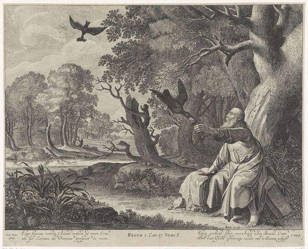 This is an engraving depicting Elijah being fed by ravens, showcasing the prophet in his moment of divine sustenance. The raven, a powerful symbol, here transcends its darker connotations, acting as a messenger and provider under God's command. Consider how this echoes the imagery of birds in ancient mythologies, like the doves of Aphrodite or the ravens of Odin, each carrying messages and shaping destinies. The gesture of Elijah, arm outstretched, is reminiscent of classical figures awaiting divine intervention. We can see a similar motif in depictions of the Annunciation, where Mary receives the angel's message, her hand often raised in a gesture of acceptance or supplication. These recurring motifs speak to a deep-seated human need for connection with the divine, a collective memory expressed through symbolic gestures and figures that transcend time. Such visual echoes remind us that art is not created in isolation but is part of a broader cultural and psychological continuum. The emotional power of this image lies in its ability to tap into our subconscious understanding of faith, hope, and the promise of divine care. The image of Elijah and the raven persists, reappearing in various forms, each time colored by the cultural and historical context in which it is reborn.