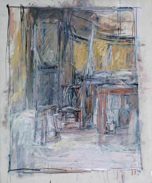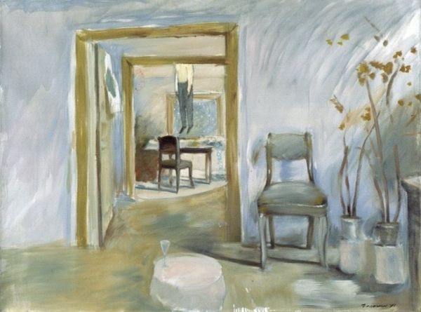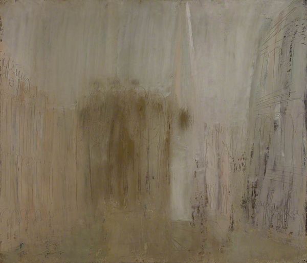 Curator: This painting, titled "Dagligstuen på Frederiksberg Allé", or "Living Room on Frederiksberg Allé", was completed by Vilhelm Hammershøi in 1887. Editor: It’s incredibly muted, almost monochrome. An overwhelmingly quiet image with curtains dominating the composition. Is it meant to convey loneliness or tranquility? Curator: I find the restrained palette creates a particular atmosphere, reflecting a Danish aesthetic tradition valuing simplicity and inward contemplation. It is as if light itself becomes a symbolic presence. Editor: How so? What does it symbolize here? Curator: Light is not merely illumination. Notice the gentle light filtering through the curtains, illuminating but also obscuring shapes. Consider light and shadow as psychological mirrors reflecting inner emotional states. They hint at mystery and impermanence. Editor: That’s true. It certainly feels far from descriptive. One could argue Hammershøi used the domestic interior as a stage to present personal psychology. Did the artist intend for these interiors to be reflections of social changes in Danish life? Curator: Indeed. Remember, this piece emerges during a period of social upheaval. Rapid urbanization and evolving gender roles shifted how people related to private space. This living room could stand for the growing importance of home, refuge from the outside world, in that transformative era. Editor: It's fascinating to see how the formal constraints and the seemingly restricted color choices amplify the image's evocative potential, encouraging us to look inward. It asks what meaning and symbolic charge could ordinary rooms contain. Curator: Precisely, by paring down representation to near abstraction, Hammershøi invites us to seek something resonant. To listen to silence, and acknowledge its layered, nuanced narratives of self.