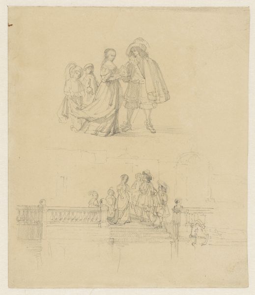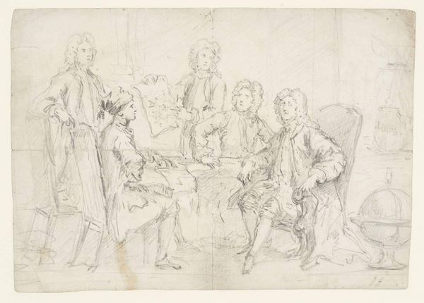 Curator: This is a sketch of "A Family Group of Five Persons, Knee-length," by Joseph Highmore. Highmore, who lived from 1692 to 1780, captured a genteel intimacy here. Editor: It looks like a preliminary study; the pencil work feels so immediate. I wonder about the paper itself. Curator: Likely a high-quality rag paper, befitting a preparatory sketch for a potential commission. Highmore was a portraitist catering to the burgeoning middle class. Editor: The family's clothing signals their status. What kind of labor went into those textiles? The lace, the tailoring... Curator: Exactly! Highmore's portraits provided visual validation of social mobility and aspiration. The drawing itself is a commodity in waiting, a potential symbol of wealth. Editor: It also seems unfinished, an interesting view into the artistic process and labor involved in portrait making. Curator: Indeed. The sketch offers a glimpse behind the scenes of 18th-century portraiture and its function in society.