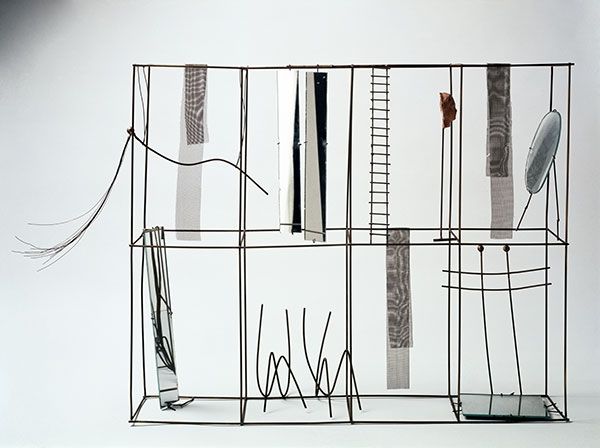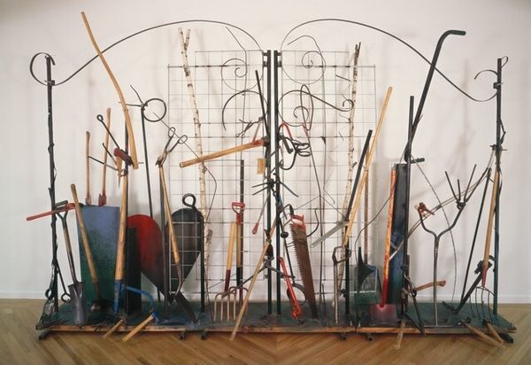 Editor: This is "Greenhouse Glut (Neapolitan)," a 1987 assemblage by Robert Rauschenberg. Looking at this jumble of chair parts and metal frames, I'm initially struck by its fragility, or maybe its transient nature, as though it's been tossed together for a temporary purpose. What are your initial thoughts? Curator: Fragility and transience, excellent observations! To me, Rauschenberg’s "combines" like this one are poems written in the language of discarded things. Think about what each of these objects *was*: a chair meant for rest, bed frames promising sleep. Now they’re defunct, upcycled into something new. It's a bit like life, isn’t it? Things break down, we repurpose ourselves. I wonder, does that Neapolitan title offer another layer for you? Editor: It does, now that you mention it! It reminds me of that layered ice cream... maybe it's Rauschenberg’s visual pun – a delicious treat constructed from the refuse of consumer culture? Curator: Exactly! And that consumer culture is both seductive and wasteful. These found objects hint at the endless cycle of production and obsolescence. And tell me, what does the open structure say to you, or suggest? Editor: I see right through it… maybe its honesty in the sense that it is revealing the ugly materials in order to get the beauty across? Curator: The beauty in decay, in transformation… I find that notion compelling. We assign value to the pristine, but what about the poetry in what’s been used, broken, and reborn? Editor: I hadn't considered it that way, but I love how Rauschenberg forces us to find beauty in the discarded and rethink our relationship with consumerism. I guess there's nothing truly useless, is there? Curator: Precisely! He saw potential in the cast-offs, inviting us to do the same. It makes me question, you know, what "waste" really *means.* And where is the real value of objects beyond utility.