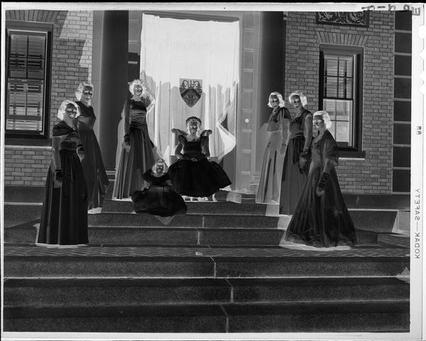 Editor: So, this is an untitled photograph by Martin Schweig, showing clergymen and altar boys on church steps. The starkness and the high contrast give it a really somber, almost ghostly feel. What strikes you when you look at it? Curator: It feels like a memory, doesn't it? A fleeting glimpse into a ritual. The steps are almost like a stage, and the figures, caught in this stark light, become players in a silent drama. I wonder what the occasion was, what prayers were said. It's an image steeped in tradition, but also somehow vulnerable, frozen in time. It makes you ponder the weight of faith, doesn't it? Editor: Definitely. Thanks, that gives me so much to think about.