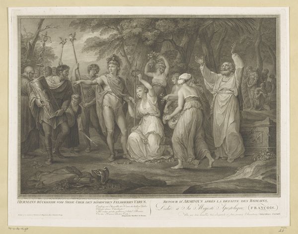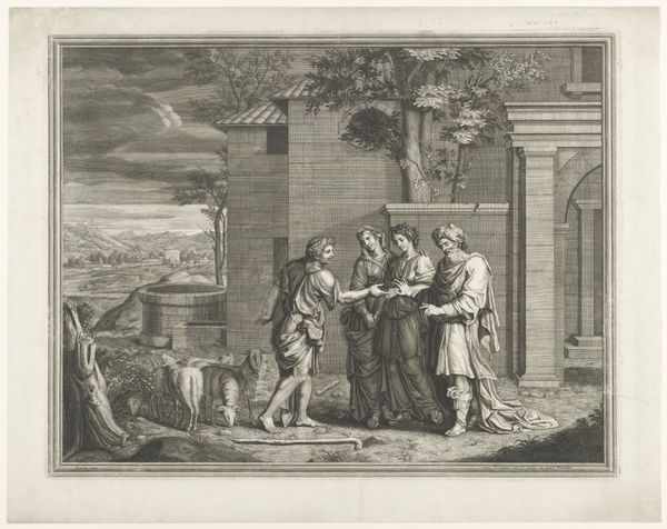 This engraving, "Offer van Iphigeneia," visualizes a pivotal scene from Greek mythology. While the artist remains anonymous, the work encapsulates prevailing attitudes towards sacrifice, duty, and gender roles. The image portrays the moment Agamemnon is about to sacrifice his daughter, Iphigenia, to appease the goddess Diana and ensure safe passage for the Greek fleet to Troy. Iphigenia kneels submissively, embodying the societal expectation of female obedience. The expressions of the surrounding figures convey a mix of horror, resignation, and grief, highlighting the emotional weight of the event. It raises profound questions about the value of individual life versus collective ambition, and the specific burdens placed upon women within patriarchal structures. The goddess Diana appears to prevent the sacrifice, perhaps suggesting a divine intervention against such extreme patriarchal demands. Consider how the artist uses this classical narrative to explore themes of power, sacrifice, and the complex intersections of gender, duty, and divine will.