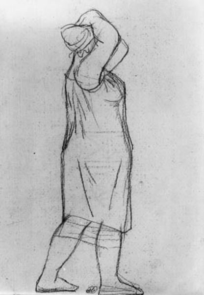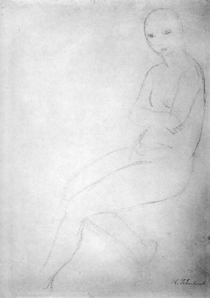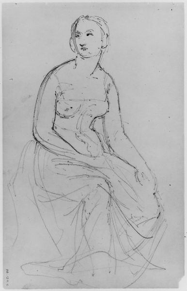 Curator: Let’s take a look at this work, entitled "Portræt af en siddende ung pige med hænderne i skødet. Annie Bjarne," a pencil drawing by Amedeo Modigliani, created in 1919. It's currently housed here at the SMK, Statens Museum for Kunst. Editor: It’s haunting, isn’t it? The pale, undefined face staring off…it gives me the chills a little. Curator: Well, consider how Modigliani often depicted the eyes of his subjects, or lack thereof. He said he would paint the eyes when he knew the soul. What might it say about the subject that the face is only lightly developed in this sketch? What of her place in post WWI Europe and as part of the Modernist artistic vanguard of Paris? Editor: True, and that’s so central to his visual language. Look at the simplification of form here – the elongated neck, the basic geometry shaping her torso. It pushes past mere representation. This rendering, almost an abstraction, amplifies the work’s quiet unease. Curator: Perhaps that sense of unease springs from something deeper. Take note of her posture. The hands are clasped demurely, but the hunched shoulders suggest a kind of introversion, a world of experience that the artist only attempts to capture a glimpse of, in only pencil. Editor: The starkness is further emphasized by the grid behind her that's likely on the original sketch paper itself. It creates a framework against the apparent spontaneity of the gesture. How do those formal qualities, the medium and line work specifically, impact our understanding? It lends it that immediacy that pencil as a medium lends. Curator: Ultimately, it’s a piece that invites us to consider not just the sitter, but the artist’s own state of mind at that historical juncture and artistic development, as he sought to define new parameters for the representation of the human form and what’s unsaid about the subject he presents. Editor: Indeed. It's this dance between the visible and invisible, the tangible and the ineffable, that really resonates here. Thanks for exploring with me!