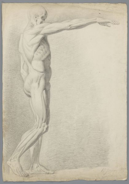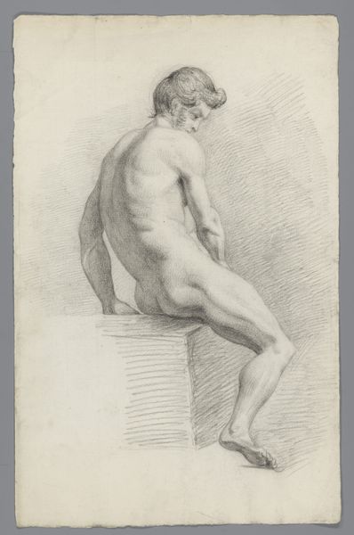 Gerard Allebé made this drawing of a standing male nude, seen from behind, using graphite on paper. The artist created soft gradations of light and shadow that articulate the figure's musculature, imbuing the artwork with a sense of volume and depth. The conscious manipulation of the graphite material—the controlled application of pressure, and the direction of the strokes—emphasizes the figure's anatomical structure, highlighting the tension and contours of the back, shoulders, and legs. This approach reflects a deep understanding of the human form, and mastery over the medium. The artist creates an aesthetic experience that extends beyond mere representation, elevating the drawing to a form of artistic expression that blends skilled craftsmanship and technical virtuosity. This artwork emphasizes the importance of the materials, the processes, and the context, challenging the traditional distinctions between fine art and craft.
