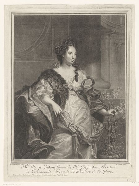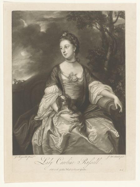 Editor: Here we have "Portret van Sarah Bates met harp en bladmuziek" by Jean Marie Delattre, from 1784. It seems to be a drawing, perhaps with pen or charcoal? I’m struck by the way the figure is framed within the oval, and the delicate use of light and shadow. How do you approach a piece like this? Curator: The composition presents a study in contrasts. Consider how Delattre uses line to delineate form. The precision in rendering the details of the harp contrasts with the softer, more atmospheric treatment of the background landscape. Note how this juxtaposition directs the viewer's eye towards the figure. How does the ovoid frame interact with this effect, in your opinion? Editor: I guess the frame concentrates the attention on her, the oval emphasizes the soft lighting on her face. It's almost like she is set apart, more important than the landscape. But why? Curator: Precisely. Delattre employs the frame to both contain and elevate the subject. The neoclassical style favored clarity of form, rational structure, and idealized representations. The carefully arranged folds of the drapery, the delicate rendering of her hair, and the controlled shading, all contribute to a sense of harmony and balance. What then, is the role of the landscape elements behind the figure? Editor: They act as a backdrop, yes? Simple hills and tress... very minimal and less distinct. Maybe to project an image of the person being portrayed, of their wealth, and elegance, rather than natural environment. Curator: A compelling assessment. Now consider the relation between musicality and artistic virtuosity expressed in visual form. Observe, how the drawing renders not only the form of harp and scroll of music but offers also the silent metaphor for melody through Delattre's skilled employment of lines. Editor: That's a neat way of thinking about it; focusing less on subject, and more on form! I'll be thinking about the power of the artist's technique from now on! Curator: A work like this encourages a close inspection of lines, shapes, and light. I invite visitors to dwell with this visual organization, and uncover new appreciation each time.