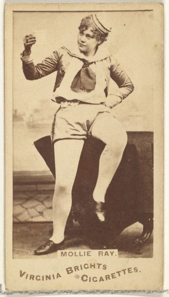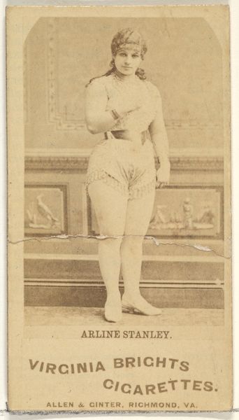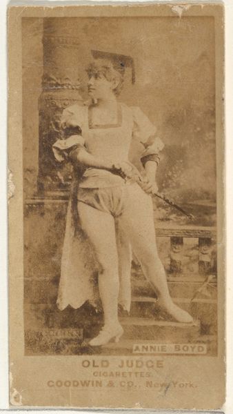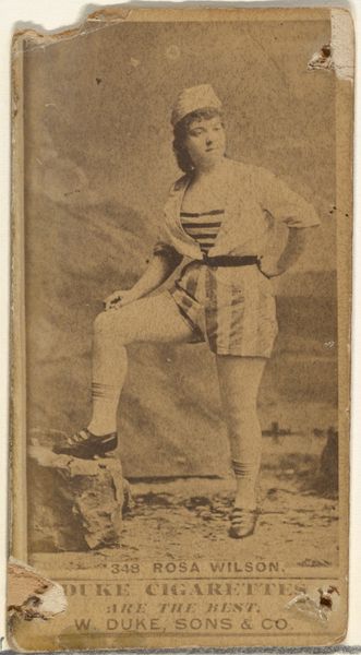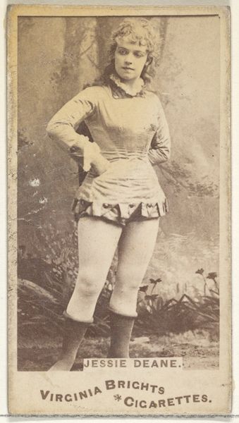 This card, "Miss Jarbeau," was produced by the Wm. S. Kimball & Co., a prominent 19th-century cigarette manufacturer. It's a photograph, mass-produced and distributed as a collectible insert within cigarette packs. The image itself is straightforward: an actress in costume, likely intended to appeal to the era's fascination with performers and the theater. But consider the material context: paper, ink, and the industrial printing processes that allowed for widespread distribution. These cards weren't meant to be high art; they were advertising, pure and simple. Think about the labor involved – from the photographers to the factory workers churning out these cards by the thousands. The commodification of image, celebrity, and even femininity itself is central here, fueled by the burgeoning consumer culture of the time. The card’s purpose was less about artistic expression and more about driving sales in a competitive marketplace. Looking at this seemingly simple photograph, we see the threads of mass production, marketing, and the social dynamics of the late 19th century, challenging our assumptions about art and value.