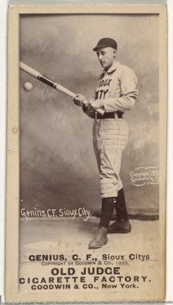 This is an 1889 photograph of Genins, Center Fielder for Sioux City, created by Goodwin & Company as part of the Old Judge Cigarettes series. These cards were inserted into cigarette packs, a marketing strategy that capitalized on the growing popularity of baseball and tobacco consumption during the late 19th century. The image captures more than just a player; it reflects the burgeoning commercialization of leisure and the construction of celebrity culture. Genins, posed with his bat, embodies an idealized version of masculinity—athletic, strong, and respectable. Yet, this image also prompts us to consider the labor behind the sport, and how class dynamics play out in professional athletics. As we observe Genins, let's reflect on how this image contributed to the mythology of baseball and American identity, fostering both aspirations and exclusions.