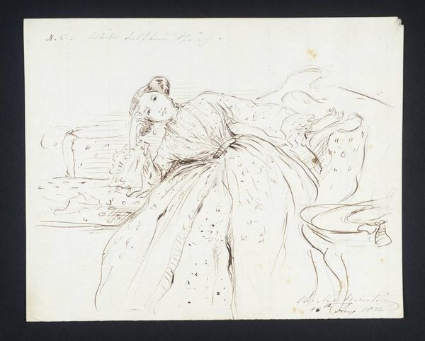 Curator: The work before us, completed in 1879, is entitled "The Artist's Daughter Eleonora Reclining on a Chaise-Longue," executed in graphite by Domenico Morelli. Editor: Immediately, I’m struck by how loose the rendering is, a sense of comfortable domesticity caught with a quickness that belies its permanence on the page. Curator: The medium used – pencil and graphite – reinforces the idea of immediacy, of capturing a fleeting moment. Morelli uses the reclining pose to suggest leisure, a popular theme among the bourgeois during that period. Editor: The hatching and cross-hatching definitely create areas of significant visual density. Notice how that clustering occurs precisely where shadow would naturally fall on the drapery of her gown and along the contour lines defining her face. It's economical and very effective. Curator: Right, the composition is clever, guiding the eye primarily to the form of the reclining girl. Morelli suggests an attitude, that pose conveying perhaps weariness, nonchalance, even boredom—elements of the interior lives of women at the time. I am also very interested in how artists like Morelli show women within intimate familial spaces as representative of domestic bliss and also the burdens placed on women's leisure. Editor: Absolutely, and consider the chaise lounge itself— it bisects the composition and serves both literally as the platform for her leisure, while its implied diagonal leans into our reading of depth. Its materiality almost dematerializes due to Morelli's delicate use of graphite to imply light. Curator: We might think of the image as a modern-day odalisque—but instead of exoticizing or eroticizing, there’s an emphasis on naturalism within her familiar world. There’s also the gaze directed to the heavens, a posture of inward reverie or perhaps a passive hope in a paternal figure that both confines her and cares for her. Editor: Indeed, through these compositional decisions and choices in the build-up of form, we gain a richer understanding of how these images are able to perform many actions for a complex readership and in that way offer cultural touchstones in this Neapolitan painter’s ouevre. Curator: Exactly. Editor: A refreshing insight.