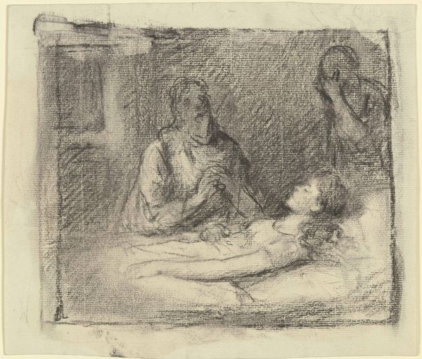 Editor: We are looking at "The Annunciation," an etching by Frans Schwartz from 1899, currently housed at the Statens Museum for Kunst. I find it interesting how the light almost entirely obscures the angel and defines the scene. How would you interpret this composition? Curator: Indeed. Observe how Schwartz masterfully employs line to delineate form and light, creating a distinct contrast between the earthly and ethereal realms. Notice the density of lines forming a darker mass on the left that embodies materiality versus the relatively sparse strokes evoking the divine light of the angel, nearly blinding to view. What impact do you think that contrast of textures creates? Editor: It almost seems to suggest the solidity of Mary compared to the insubstantial, heavenly form of the angel Gabriel. Is the choice of the etching medium itself significant here? Curator: Precisely! Etching, with its capacity for finely controlled lines, lends itself perfectly to capturing subtle tonal gradations, which creates a luminous and dynamic tension. Also, look closely at how the lines do not overlap to produce shading, and consider the implication. The overall impact of Schwartz’s choices evokes a mood of contemplation and otherworldliness. Editor: It really pushes beyond a simple representation of the Annunciation to a deeper exploration of light and form. I appreciate how you pointed out the way the formal elements themselves contribute to the overall meaning. Curator: The interaction between light and dark, line and form—that is the language through which Schwartz articulates the profundity of the scene. I am delighted we were able to consider the forms with care today!