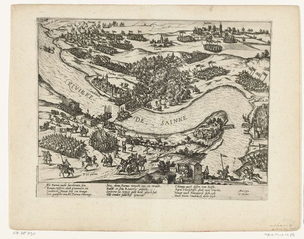 Editor: This engraving, "Siege and Conquest of Rheinberg, 1597" by Bartholomeus Willemsz. Dolendo, was made between 1600 and 1610. It’s a really detailed city map. What strikes me is how functional it seems, less art, more documentation. How do you interpret this work? Curator: Precisely! Consider the context: the booming print industry of the Dutch Golden Age. This wasn't necessarily ‘high art’ in its own time. Engravings like these served a purpose; to inform, to celebrate victories, to circulate knowledge. The lines weren’t so strict between art and craft back then. How do you think the production of such a detailed print affected how people understood warfare? Editor: I suppose it made it more tangible, more digestible. Like a news report almost. Did the wide availability of prints change the public’s relationship with military campaigns? Curator: Absolutely. Think about the labour involved – the engraver translating the real-world event, perhaps even other artists’ sketches, into a reproducible image. It demystifies events like this siege. These weren’t just grand happenings; they were commodities, consumed visually. Editor: That's a good point. I hadn't considered the print as a commodity itself, subject to its own market pressures. Curator: Exactly. We need to look at the socio-economic factors driving its creation and distribution. What do the materials, the copperplate and ink, tell us about the resources invested in disseminating this particular image of Dutch military power? Editor: So, instead of seeing just a historical depiction, we can examine it as a product of its time, shaped by materials, labor, and even consumerism. Fascinating! Curator: Precisely! Seeing it that way reveals the rich social tapestry woven into the art-making process.