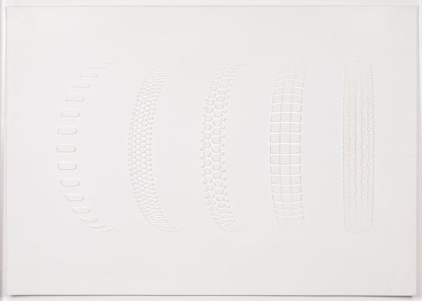 Curator: Kim Lim's "Relief" presents a fascinating study in subtle geometric forms. Editor: It feels muted, almost ghostly, with those pale lines barely discernible against the background. What's the story? Curator: Lim, a Singaporean sculptor, explored minimalist abstraction. Here, we see her interest in texture and simple shapes, creating a visual poem of light and shadow. Editor: Given Lim's background, I wonder if this quietude is a response to the clamor of post-colonial identity, a deliberate withdrawal into the self? Curator: That's an intriguing reading, but I am most drawn to the interplay of the lines, how they create a sense of depth despite their apparent flatness. It’s a masterclass in spatial illusion. Editor: Perhaps, but understanding Lim's work only through a formalist lens risks overlooking the potential for deeper cultural and personal narratives. Curator: I see your point, and yet, the universal language of geometry is powerful, don’t you think? Editor: It has its place, yes, but context is crucial. Curator: Indeed, perhaps the tension between form and context is where the true meaning resides. Editor: A fitting end to our conversation, highlighting the multifaceted nature of art itself.