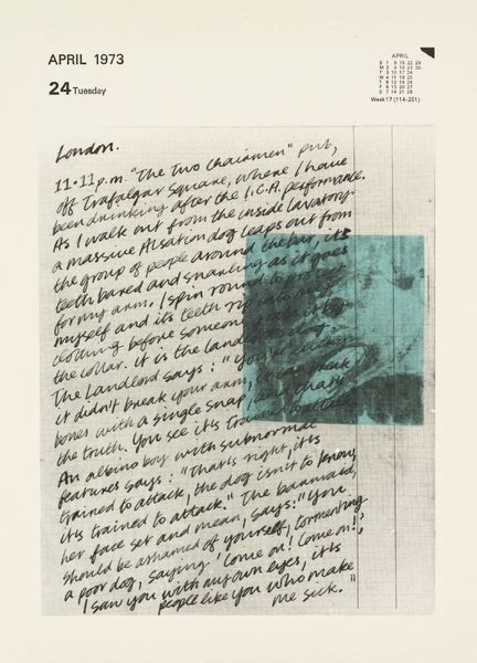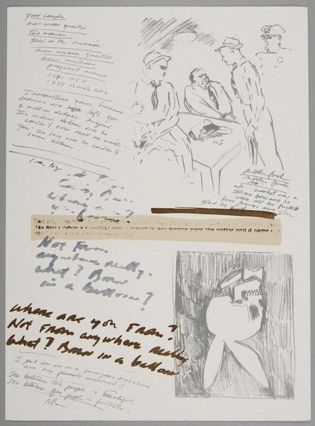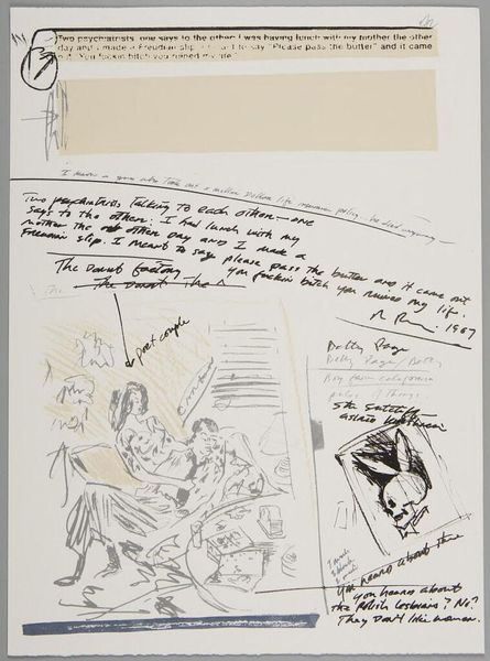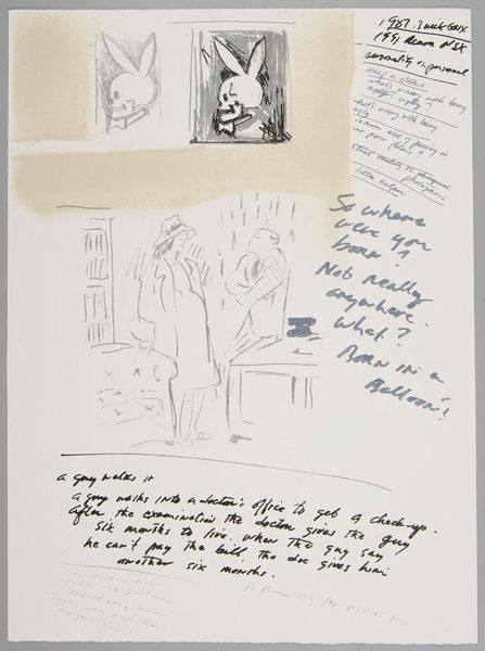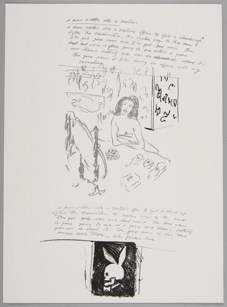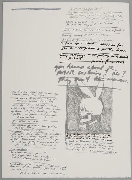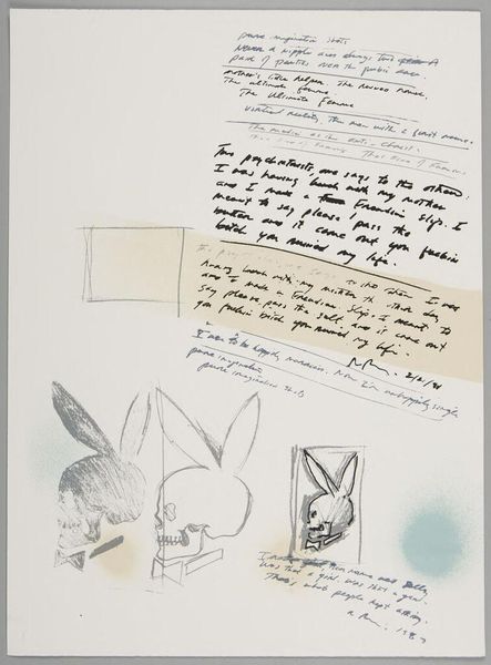 Curator: What strikes me immediately about this untitled work by Richard Prince is its raw, almost frantic energy. The layering of image and text feels very immediate, like a glimpse into the artist's stream of consciousness. Editor: Indeed, the composition is a fascinating interplay between the visual and the textual. The skull-bunny motifs, rendered in what looks like ink or charcoal, contrast starkly with the handwritten and collaged text fragments. Curator: Precisely. Observe how Prince employs the Playboy bunny icon, juxtaposing it with skull imagery to create a visual paradox. It's a commentary on mortality and the fleeting nature of desire, wouldn’t you say? Editor: I see it more as a kind of dark humor. There's a sardonic edge to the juxtaposition. The snippets of jokes and phrases seem to amplify a sense of anxiety. Curator: Perhaps it’s both, a confluence of dark humor and existential reflection, which brings us to consider the materiality of the work itself. The visible texture suggests a deliberate roughness, almost anti-aesthetic. Editor: It's a fascinating piece, with layers of meaning and materiality that keep you looking. Curator: Yes, a work that invites us to ponder the ephemeral nature of culture and the darker undercurrents beneath the surface.