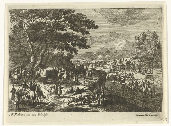 Curator: Let's explore "An Artist Sketching Outside the Walls of a Seaport" by Claude Lorrain. Editor: The etching has a placid feel, despite the activity. The composition guides my eye through the scene, from the artist in the foreground to the distant ships. Curator: Lorrain, working in the 17th century, was deeply influenced by the sociopolitical climate of his time. His idealized landscapes often reflected the aspirations and anxieties of a society grappling with expansion. Editor: The light in this etching is striking. It seems to come from everywhere and nowhere, unifying the disparate elements. It gives a sense of infinite depth, despite its small scale. Curator: Absolutely. The artist's presence reminds us of the power dynamics inherent in representation—who gets to observe and depict whom? The port could also be interpreted as a site of commerce and colonial ambition. Editor: Perhaps. Ultimately, I find it a beautiful construction of tonal values. Curator: A wonderful lens through which to appreciate it.