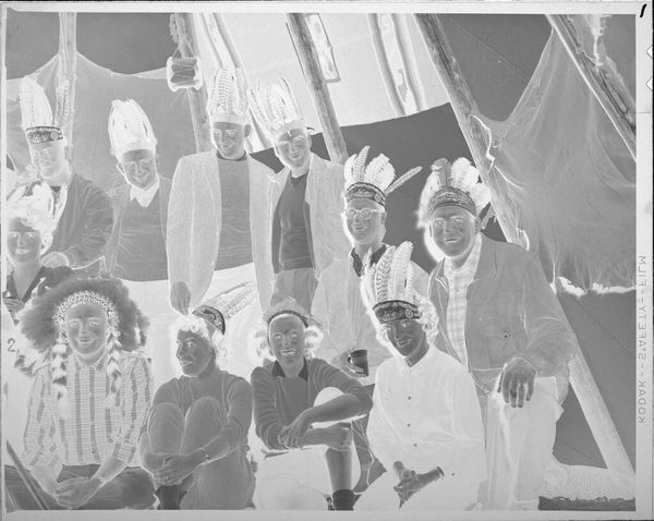 Editor: This untitled photograph by Lucian and Mary Brown shows a group of people in headdresses inside a tipi. The image feels…performative. What cultural symbols do you see at play here? Curator: The headdresses, the tipi – these are potent symbols appropriated from Indigenous cultures. But notice the varied attire. What does this juxtaposition suggest about identity and representation? Editor: It's like they're playing dress-up. Does that say something about how they view this culture? Curator: Precisely. The photograph becomes a document of cultural appropriation, revealing a specific historical perspective and power dynamic. Consider how these symbols reinforce or challenge existing narratives. Editor: So, it's not just about what's in the image, but what the image *does*. Curator: Exactly. Visual symbols carry emotional, cultural, and psychological weight. And that weight shifts depending on who is using them.