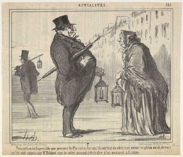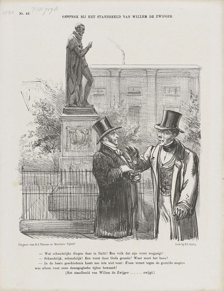 Editor: This is "Ah, here are some funny..." by Honoré Daumier. It looks like a lithograph, and I’m immediately drawn to the contrast between the refined couple and the men in what seem like strange costumes. What do you see in this piece? Curator: The costuming is key, isn't it? Daumier often used dress as a visual shorthand. The pointed hat, the rustic overalls...they evoke archetypes. But what do these figures *mean* to a Parisian audience of that time? Editor: So, you are suggesting these characters would be universally known? Curator: Precisely. Visual symbols, like characters, carry cultural memory. Daumier uses that memory to subtly critique the society he depicts. It makes me wonder, what other cultural references are embedded within? Editor: That’s fascinating. I never considered how much cultural context is embedded in simple clothing choices. Curator: Indeed. Symbols are never truly simple. They are echoes of shared experience.